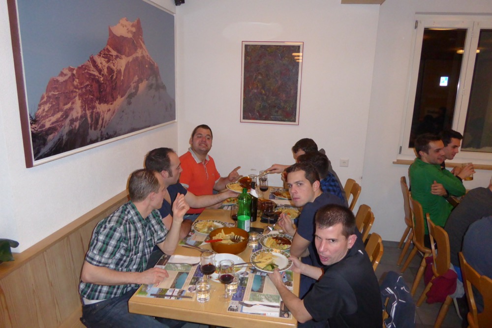 Auch ohne Skifahren nahm der Tag einen tollen Verlauf. Nachdem alle bewiesen hatten, genug Sitzleder zu haben um auch in den Bergen mehrere Stunden am Stück in einer Beiz sitzen zu können, entschied sich die Gruppe doch noch die Beine zu benutzen. Nach einer wilden Abfahrt hinunter ins Tal wurde nämlich im Chalet in der Tanz-Talstation gekonnt das in Skischuhen verpackte Bein geschwungen. Da der Schweiss in Strömen floss zog es die Gruppe bald weiter zu Dusche und Abendessen. Die Pension St. Jakob liess es auch dieses Jahr an nichts fehlen und die Stimmung war weiter heiter und ausgelassen.