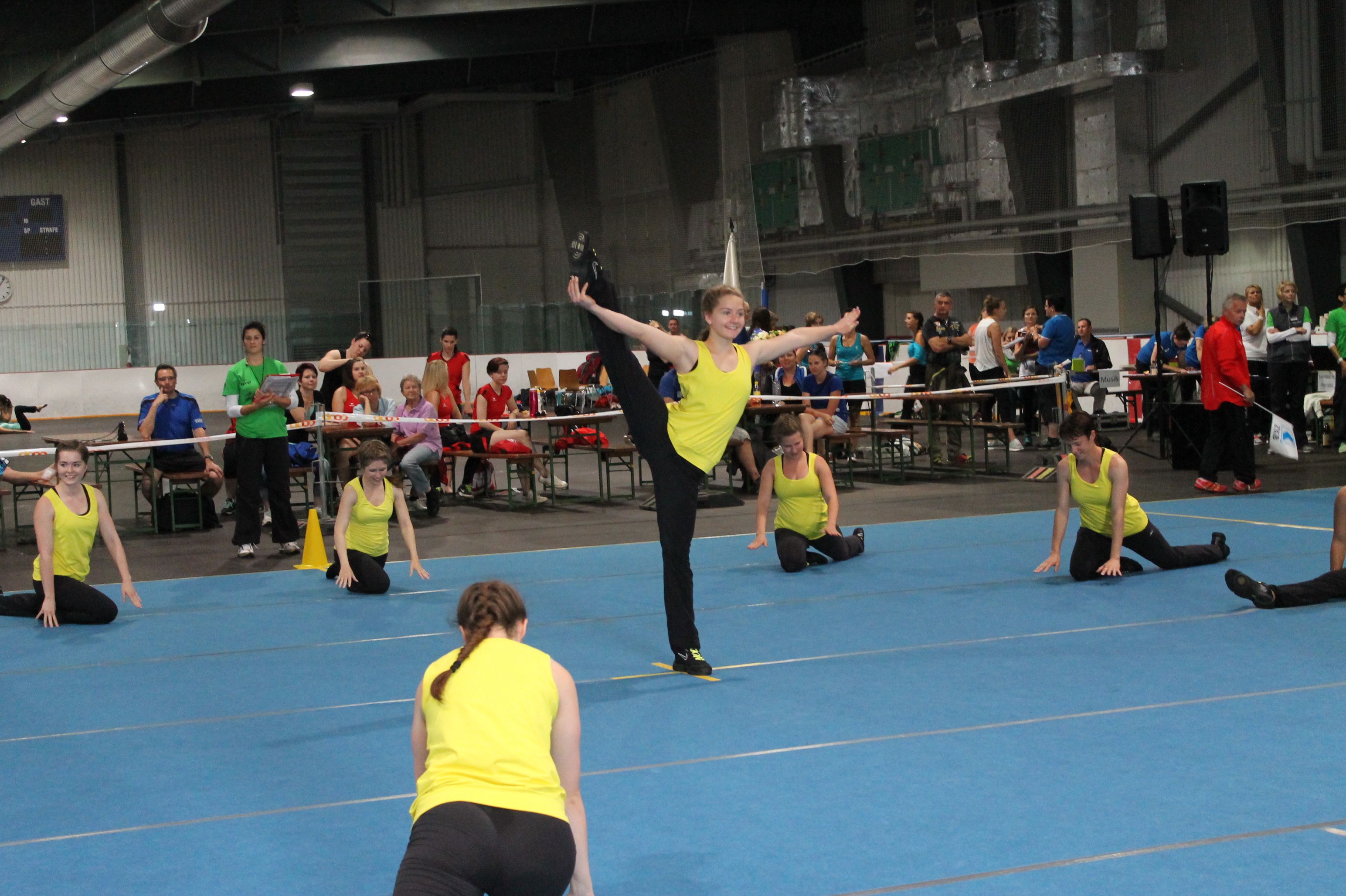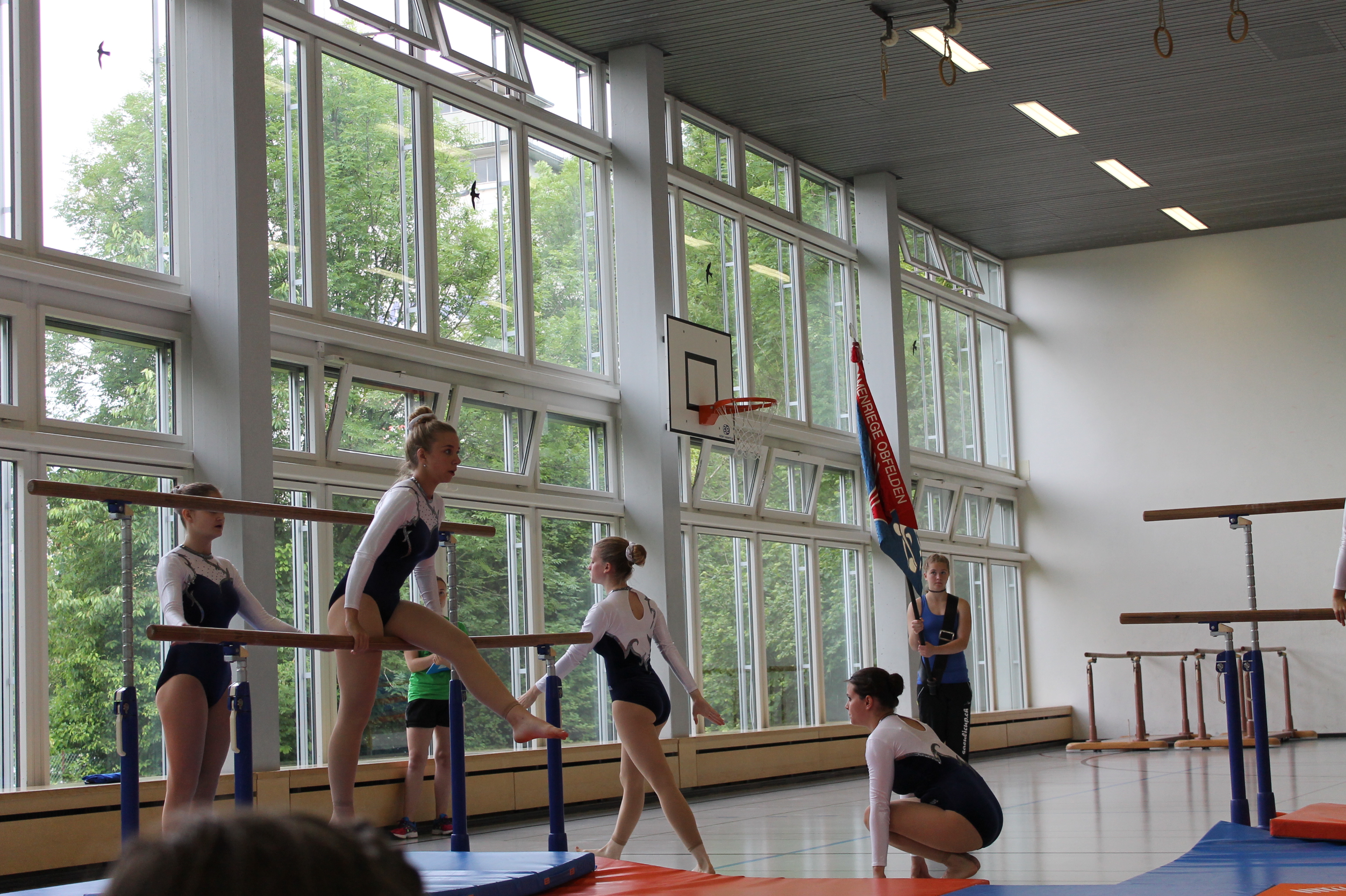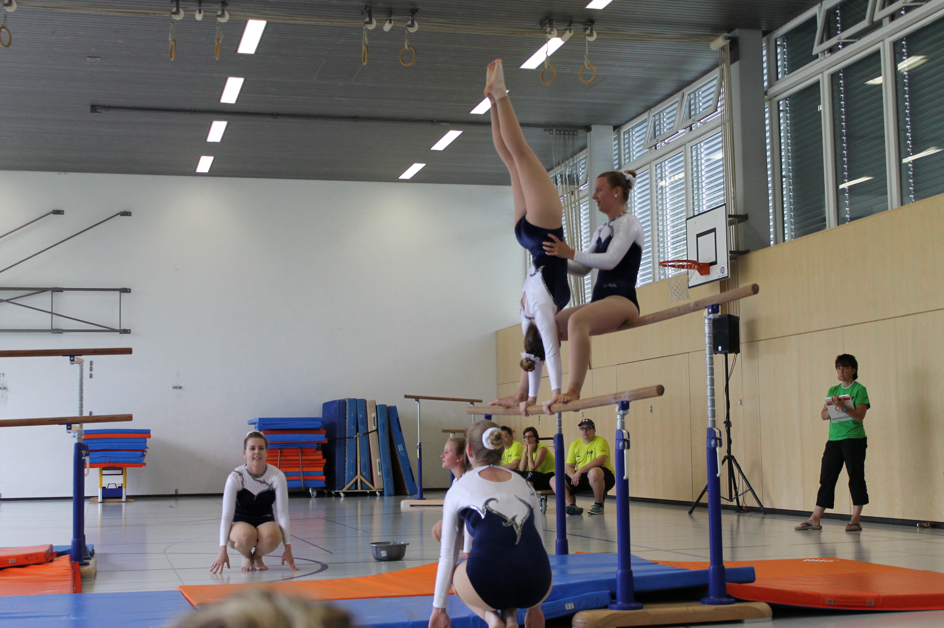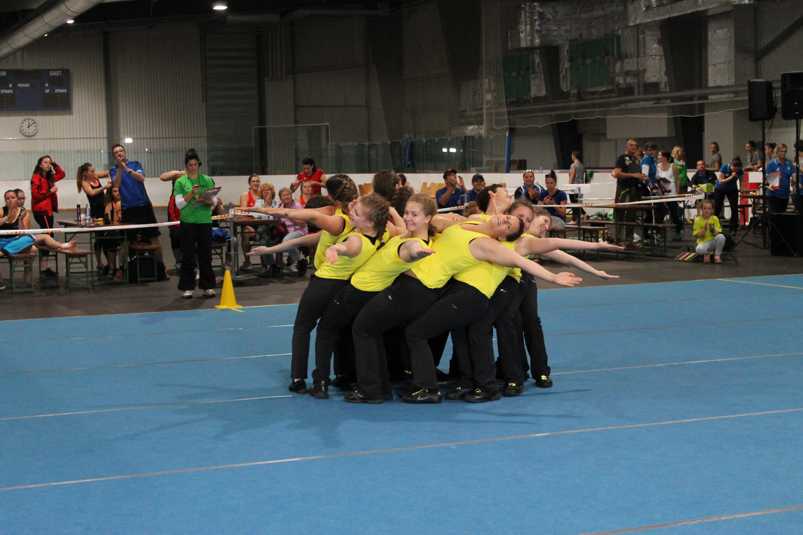 Die Fachtestler der Damenriege eröffneten den Wettkampf um 9:18 Uhr. Sie hatten Glück mit dem Wetter, die Wolken hatten sich zurückgezogen und sogar ein paar Sonnenstrahlen kamen zum Vorschein.  Begonnen haben die Damen mit dem Gobaspiel. Im Vergleich zum Training konnten sie sich steigern und waren sichtlich zufrieden mit Ihrer Leistung. Als nächstes stand das Beachball Spiel auf dem Programm der Damenriege. Leider konnten sie den Erfolg vom ersten Spiel nicht mitnehmen. Trotzdem konnten sie auch diesmal zufrieden sein und sie beenden ihren Wettkampf mit einer Note von 8.41. Weiter ging es mit den Turnerinnen am Stufenbarren. Da sie die ersten waren in dieser Disziplin, bemerkten sie auch die Mängel an den Barren. Schnell wurden diese repariert und sie konnten mit dem Wettkampf starten. Mit einer sehr guten Leistung und fehlerfreien Übungen wurden sie schlussendlich mit der fünftbesten Note in dieser Disziplin, einer 9.10, belohnt. Das Team Aerobic beendete ihren Wettkampf in der Curlinghalle. Auch sie konnten ihren Wettkampf mit einem Lächeln beenden. Trotz kleinen Fehlern wurden sie von den Zuschauern mit einem riesigen Applaus verabschiedet und erhielten für den Auftritt eine 8.55.