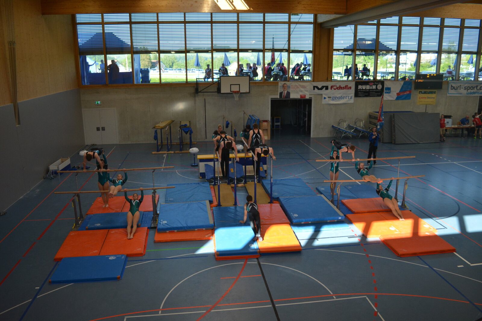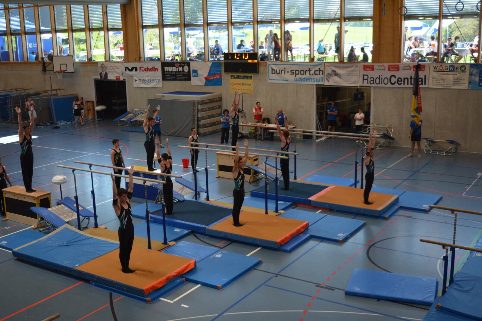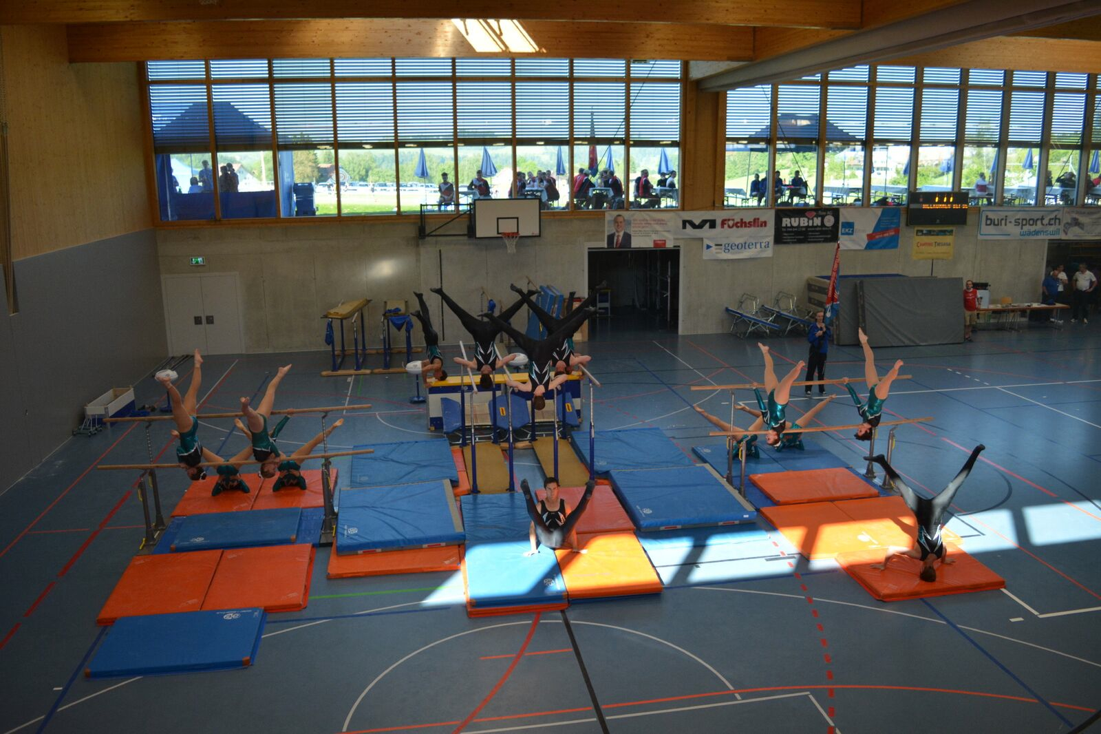 Der Schulstufenbarren startete mit ein wenig Verspätung mit der Aufführung. Da wir im Vorfeld schon ein Ziel hatten und wieder Regionenmeister werden wollten war der Druck ein wenig höher als sonst. Aber wir meisterten dies mit bravour und konnten mit der Synchronität und Ausführung punkten. Am Schluss wurden wir mit der Note 9.45 belohnt und hatten somit die Latte hoch gestellt, jetzt hiess es aber nicht auf den Lorbeeren ausruhen, denn am Nachmittag mussten wir, wie schon erwähnt, die Übung nochmals zeigen, da das Gesamttotal der beiden Noten zählte. Nach einer längeren Pause und extremer Hitze durften wir am Nachmittag die Aufführung nochmals wiederholen und konnten uns sogar um 0.05 Punkte steigern und erhielten eine Note von 9.50 für diese Darbietung.