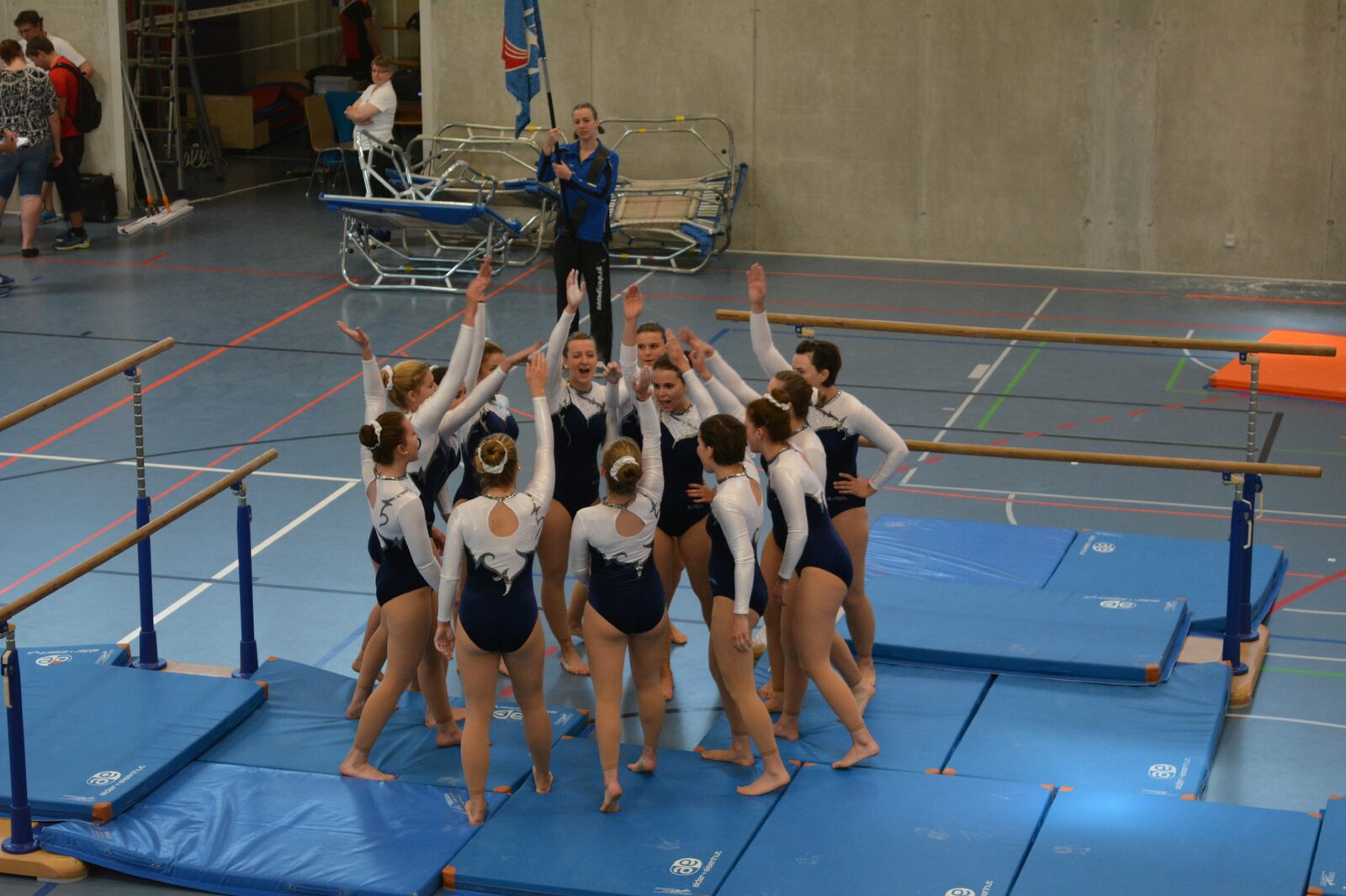 Am Barren mussten wir aufgrund von Abwesenheiten und deshalb teils langen Turnpausen Abzüge in der Programmzusammenstellung hinnehmen. Diese konnten im ersten Durchgang mit tollen Einzelausführungen und Synchronitäten wettgemacht werden, sodass unsere Vorführung mit einer 9.20 bewertet wurde. Im zweiten Durchgang hatten wir Materialpech…ein Barren entpuppte sich als regelrechtes Zittergerät, da er mehr einer wackligen Hängebrücke ähnelte als einem Barren. So litten leider auch unsere Einzelausführungen und Synchronitäten darunter. Nichts desto trotz konnten wir uns eine 9.13 gutschreiben lassen.