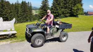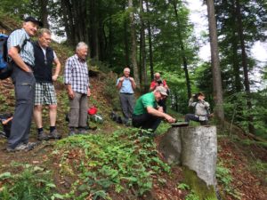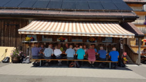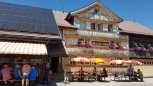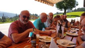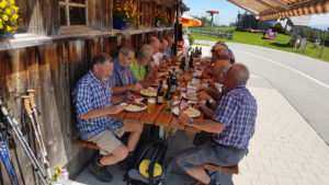 Nach dem Kafihalt ging‘s dann – unter Leitung des fitten Reiseleiters Paul – schnurstracks hinunter nach Landmark. Danach ging‘s wieder einige 100m hoch zum höchsten Punkt, bekannt als «Suruggen». Kaum oben angelangt, packte Paul spontan und zu unserer freudigen Überraschung eine Flasche «Appenzeller-Kräuterbitter» aus und verteilte jedem einen zünftigen Schluck als Aperitif. Hierdurch gestärkt und vor allem hochmotiviert nahmen wir dann die letzten Kilometer unter die Füsse. Nach 30-minütigem Marsch erreichten wir das wunderschön gelegene Bergrestaurant «untere Gäbris» auf 1200 m.ü.M. Kaum angekommen wurden bei der figulanten Appenzeller-Wirtin Vreny heimische Südwürste oder Schüblig mit feinem Härdöpfelsalat bestellt; selbstverständlich durfte der Dessert nicht fehlen! Dass an diesem heissen Wandertag auch der Flüssigkeitshaushalt quasi hochgehalten werden musste, ist selbstredend klar! Danach ging‘s gemütlich hinunter nach Gais, dort mussten wir nochmals kurz nachtanken – ein kühles Bier war dringend gefragt!