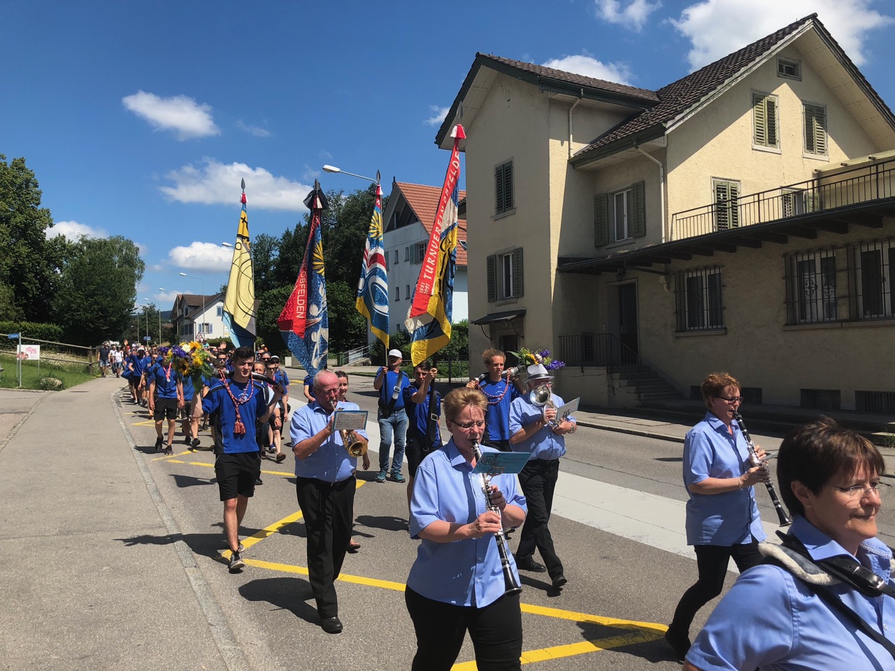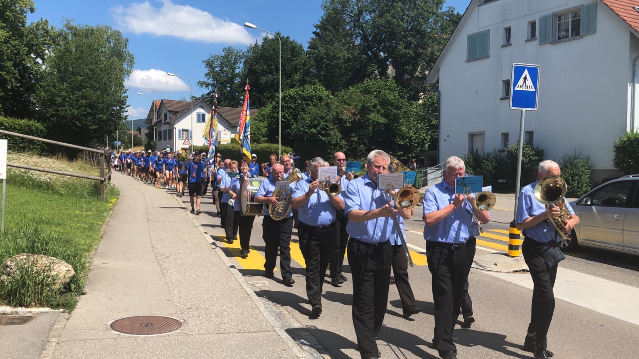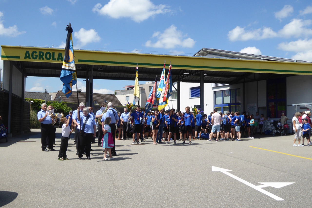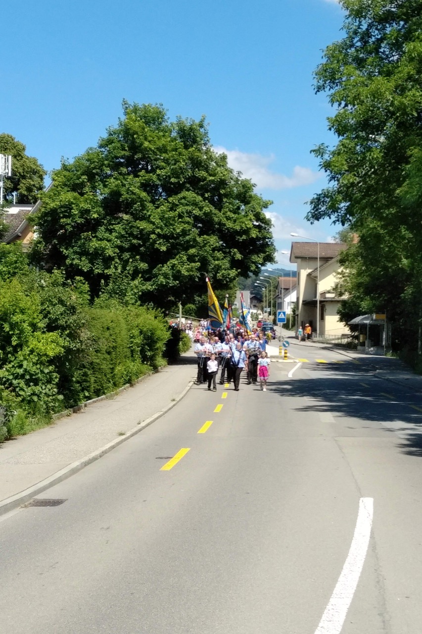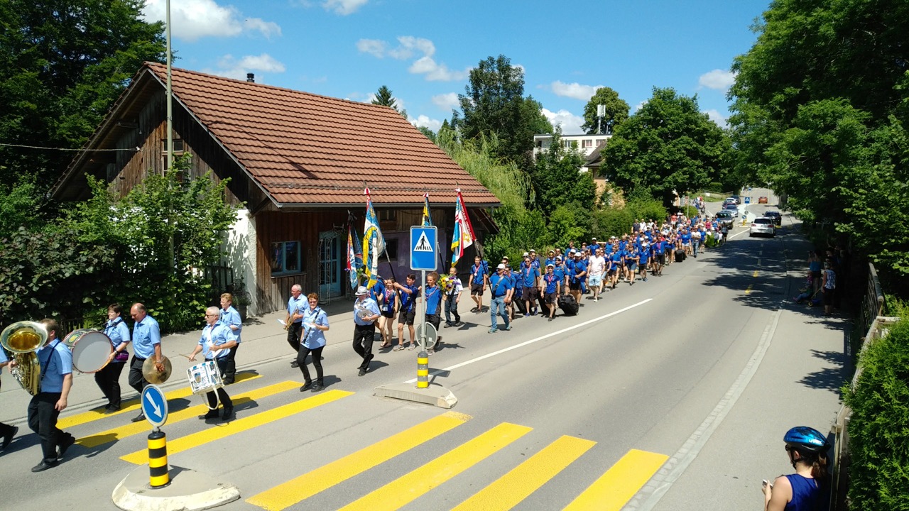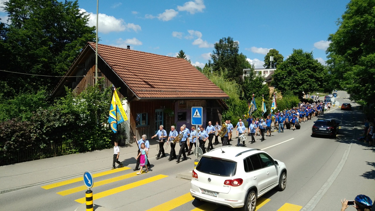 Der gut 15-minütige Marsch ging vom Dorfmärt Obfelden bis zur Weinhandlung Küferweg Begleitet von Marschmusik vom Musikverein Obfelden schritten wir die Dorfstrasse hinab.