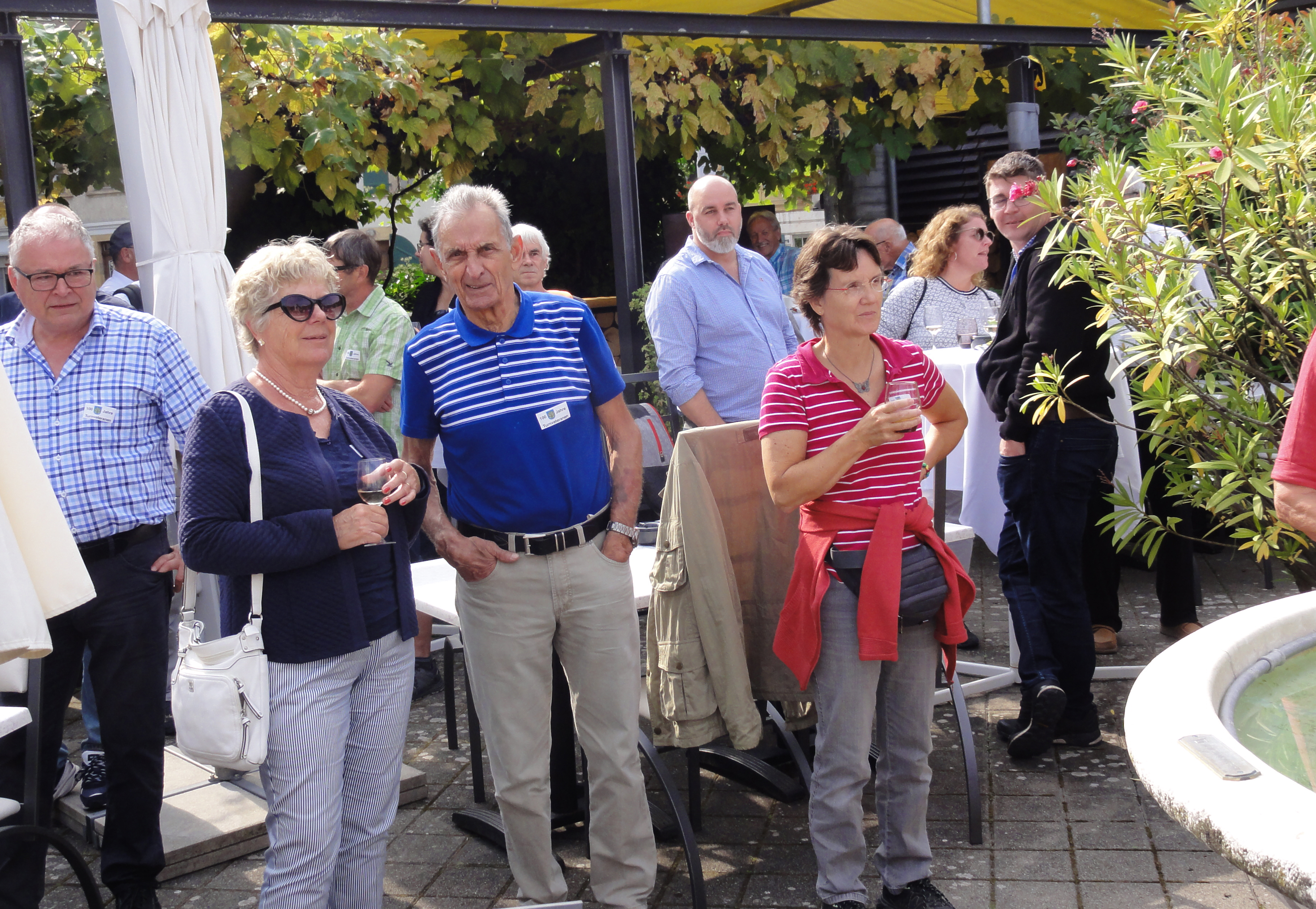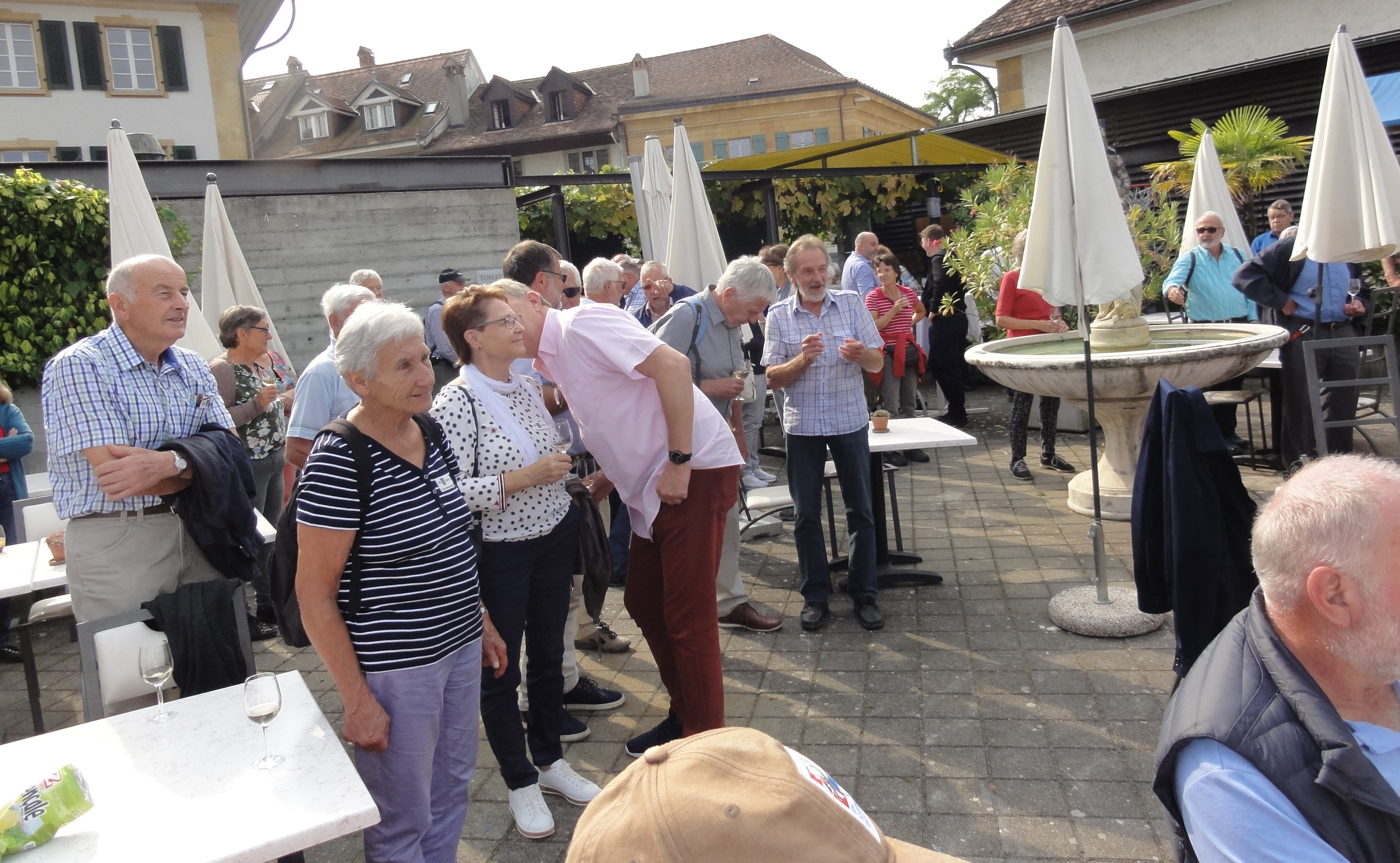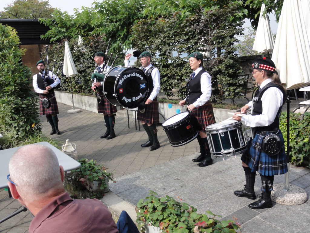 Um 07.30 Uhr trafen sich 75 Turnveteranen mit Partnerinnen beim Zendenfrei und mit 2 Bussen ging es Richtung Bern. In der Autobahnraststätte Gunzgen-Nord gab es Kaffee und Gipfeli. Nach der Weiterfahrt ging das Raten weiter wohin wir wohl fahren werden. Erst kurz nach Bern löste sich das Rätsel und um 11.00 Uhr trafen wir in Murten ein. Im Garten des Hotel Murtenhof genossen wir den Apéro (offeriert von der Gemeinde Obfelden). Zur grossen Überraschung hört wir Musikklänge. Die McBoreStore Pipe Band marschierte mit 2 Dudelsackpfeifer inkl. Begleitung in den Garten ein und erfreute uns mit einem kleinen Konzert.