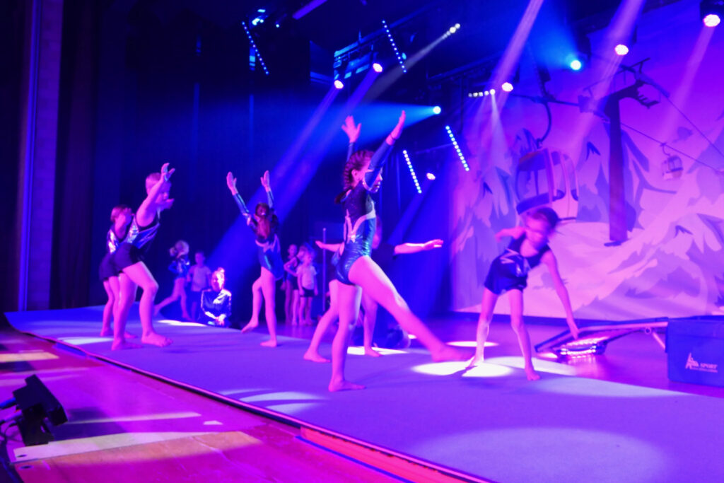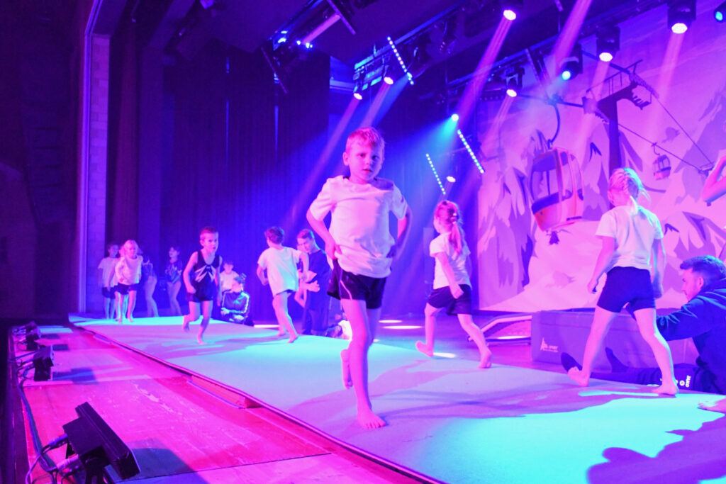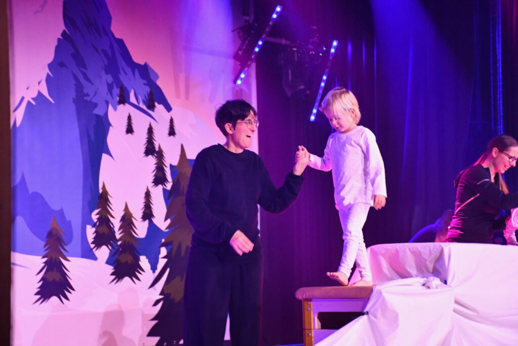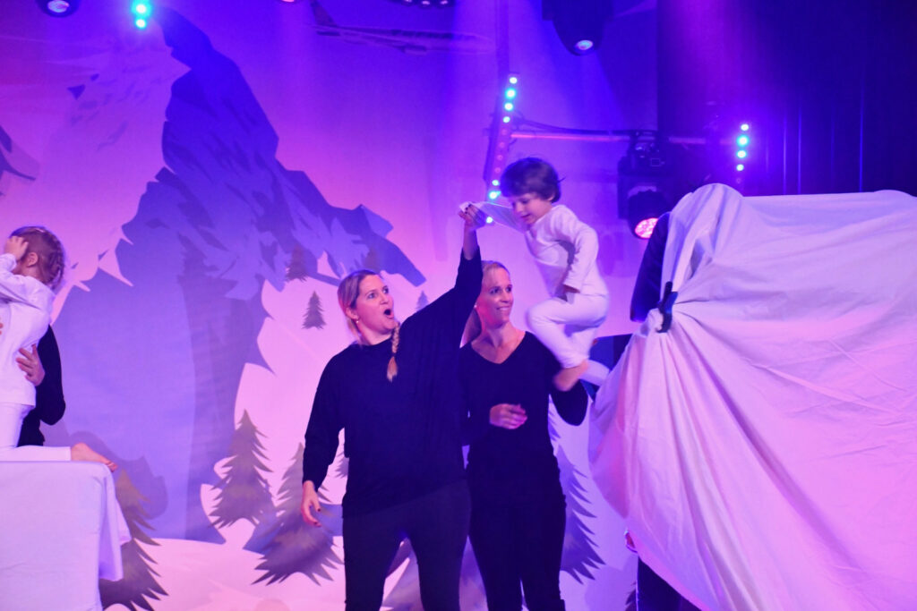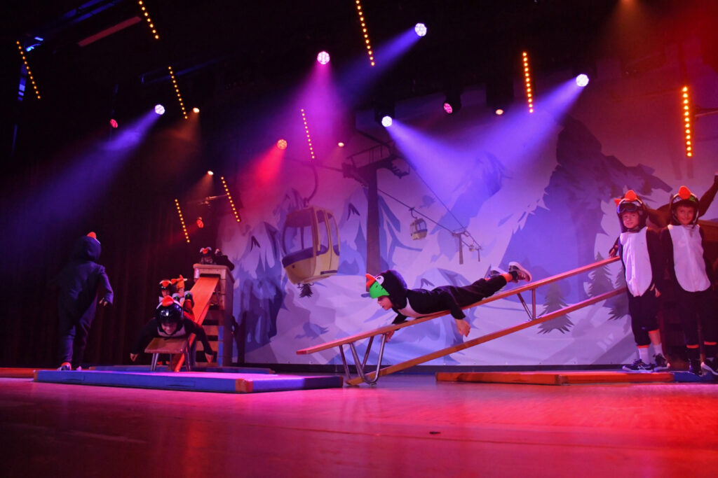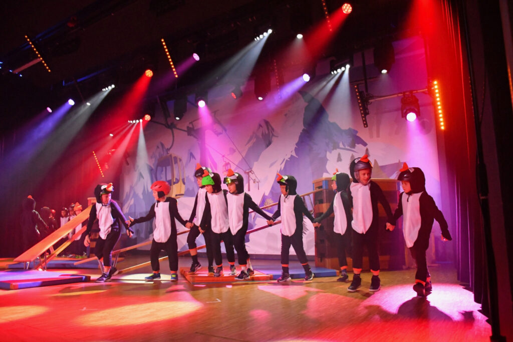 Ein erstes turnerisches Highlight bot die Geräteriege auf dem Airtrack. Inmitten der Zuschauer zeigten diese waghalsige Sprünge, aber auch ästhetische Bodenübungen. Danach war die Bühne wieder frei für die kleine Jugi, welche sich aufwändig als Pinguine verkleidet auf der Bühne bewegten.