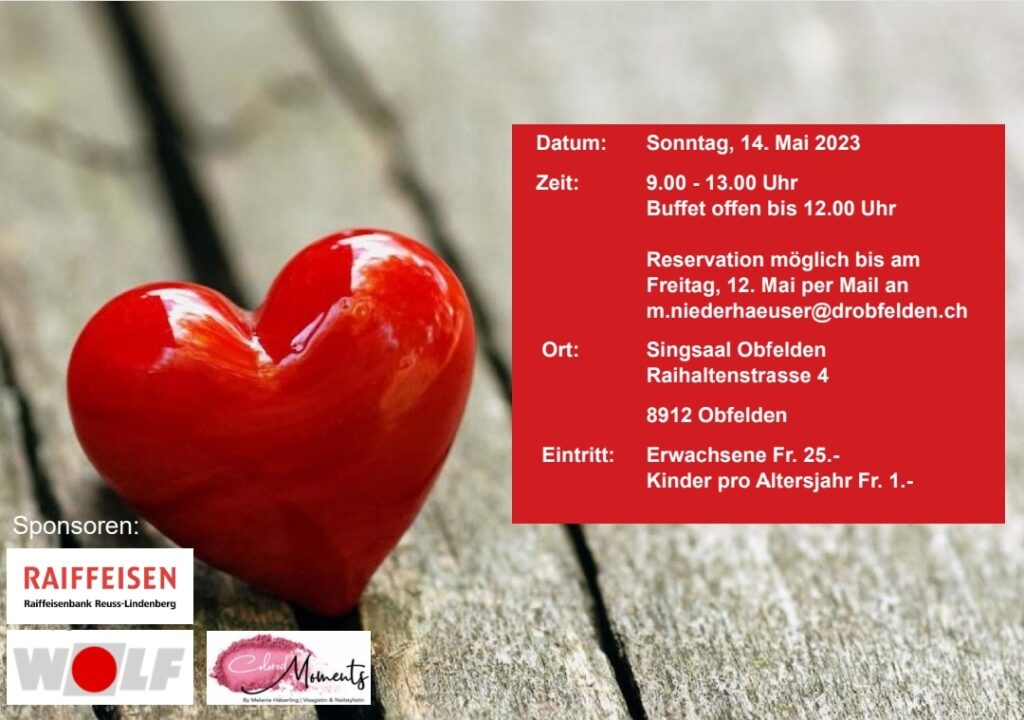 Schon bald flattern die Flyer für unseren diesjährigen Muttertagsbrunch in die Haushalte von Obfelden. Leider mussten wir, aufgrund Veränderungen in der Gemeinde, kurzfristig den Veranstaltungsort wechseln. Leider reicht die Zeit nicht um neue Flyer zu drucken und verteilen zu lassen.