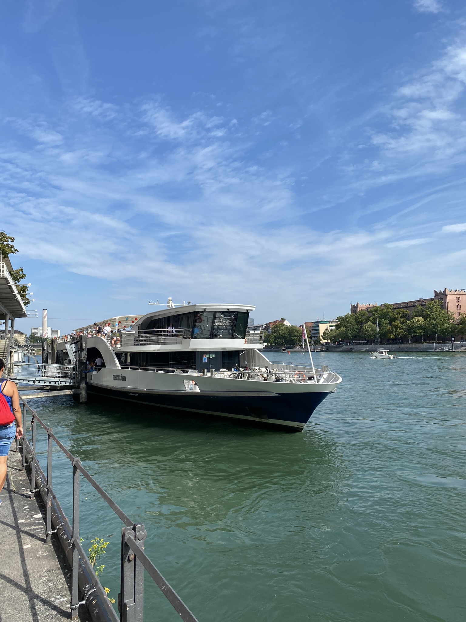 Nächster Treffpunkt war die Schifflände, wo wir wieder vereint auf einer wunderschönen Schifffahrt bis nach Rheinfelden ein sehr feines Mittagessen einnahmen. Nach 90 Minuten und zwei passierten Schleusen, sind wir an unserem zweiten Ziel angekommen. Viele erstaunte Gesichter schauten uns beim Steg entgegen und wir hörten den ein oder anderen sagen, «wow, ist das eine grosse Reisegruppe» oder «wird wohl ein Raiffeisenausflug sein». Nun durften wir uns während rund einer Stunde frei vergnügen, bis wir uns wieder beim Car trafen. Die Einen zog es sofort ans Ufer des Rheins, wo sie sich eine Abkühlung im herrlichen Wasser gönnte und die anderen spazierten durch die Altstadt.