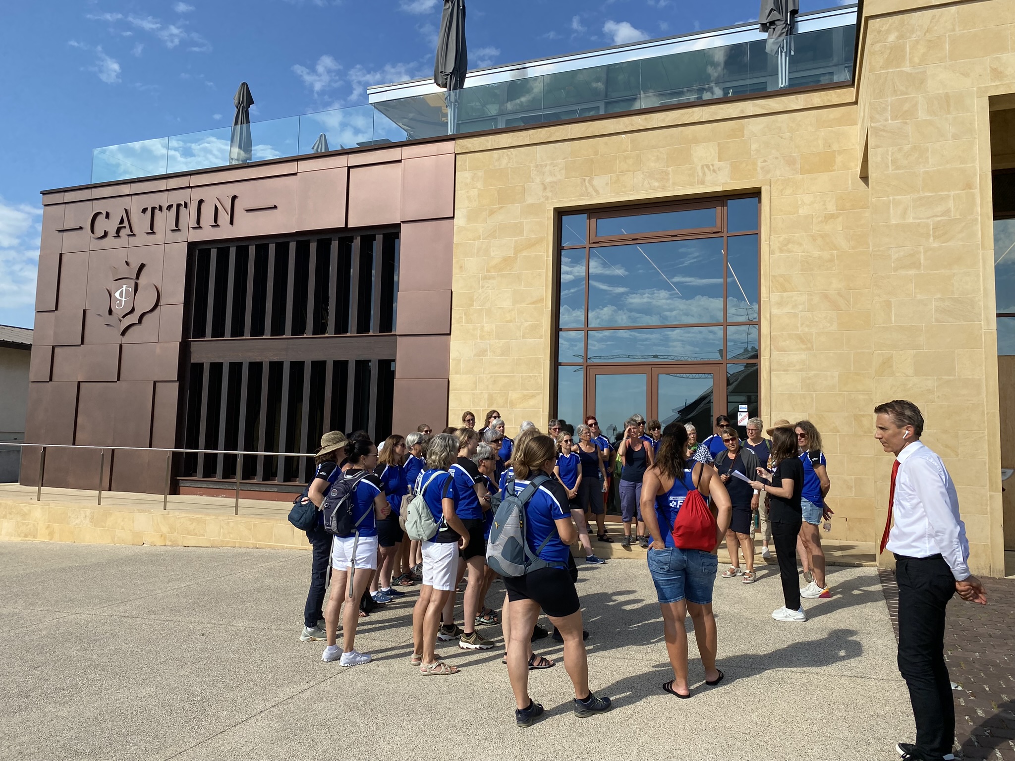 Am nächsten Morgen konnten wir es gemütlich angehen. Ein feines Frühstückbuffet erwartete uns. Um 09.30 Uhr nahmen wir wieder unsere Plätze im Car ein, der uns weiter in Richtung Voegtlinshoffen brachte ins Weingut ‘’Maison Cattin’’. Nach Besichtigung des schönen Weinkellers durfte eine Degustation natürlich nicht fehlen. Wir wurden verköstigt mit einer prachtvollen Vesperplatte, Salat und Speckzopf. Trotz der grossen Hitze, nahmen 34 Frauen den kurzen Spaziergang auf sich, durch die Rebberge mit wunderbarer Aussicht. In Egiusheim angekommen, trafen wir zum Glück drei grosse Brunnen an, wo diverse darüber baumelten, um sich etwas abzukühlen. Durch wunderschön dekorierte Gassen, mit vielen kleinen Läden und charmanten Bistros, schlenderten wir gemütlich zum Car zurück. Weiter ging unsere Fahrt nach Hartheim am Rhein (DE) zum Bohrerhof, was unser letzter Halt war. Im schönen Hofladen wurde fleissig eingekauft. Die Auswahl war riesig und sehr liebevoll hergerichtet, Alle waren begeistert. Zum Abschluss durften wir nochmals zu Tisch sitzen und ein feines, leichtes Abendessen geniessen.