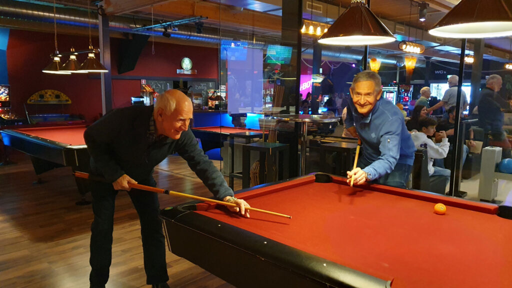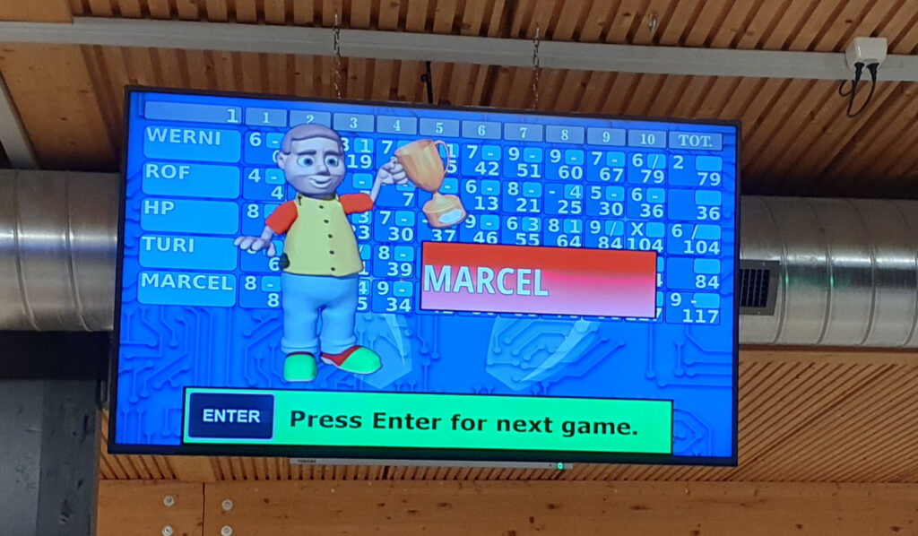 Jeder der aktiven Kameraden hatte überaus rasch seine bevorzugte „Sportart“ entdeckt und es wurde von Beginn weg beim Jassen, beim Bowling, Billiard- und sogar beim Dartspiel recht ambitiös „gekämpft“, selbstredend immer mit dem nötigen Schalk halt. Es zeigte sich recht rasch, dass unsere eher „älteren Hasen“ meist ein Mü besser waren, so dass sich die „Jüngeren“ wirklich sputen mussten, diesen denn auch halbwegs Paroli bieten zu können! Marcel’s Effort lässt grüssen!