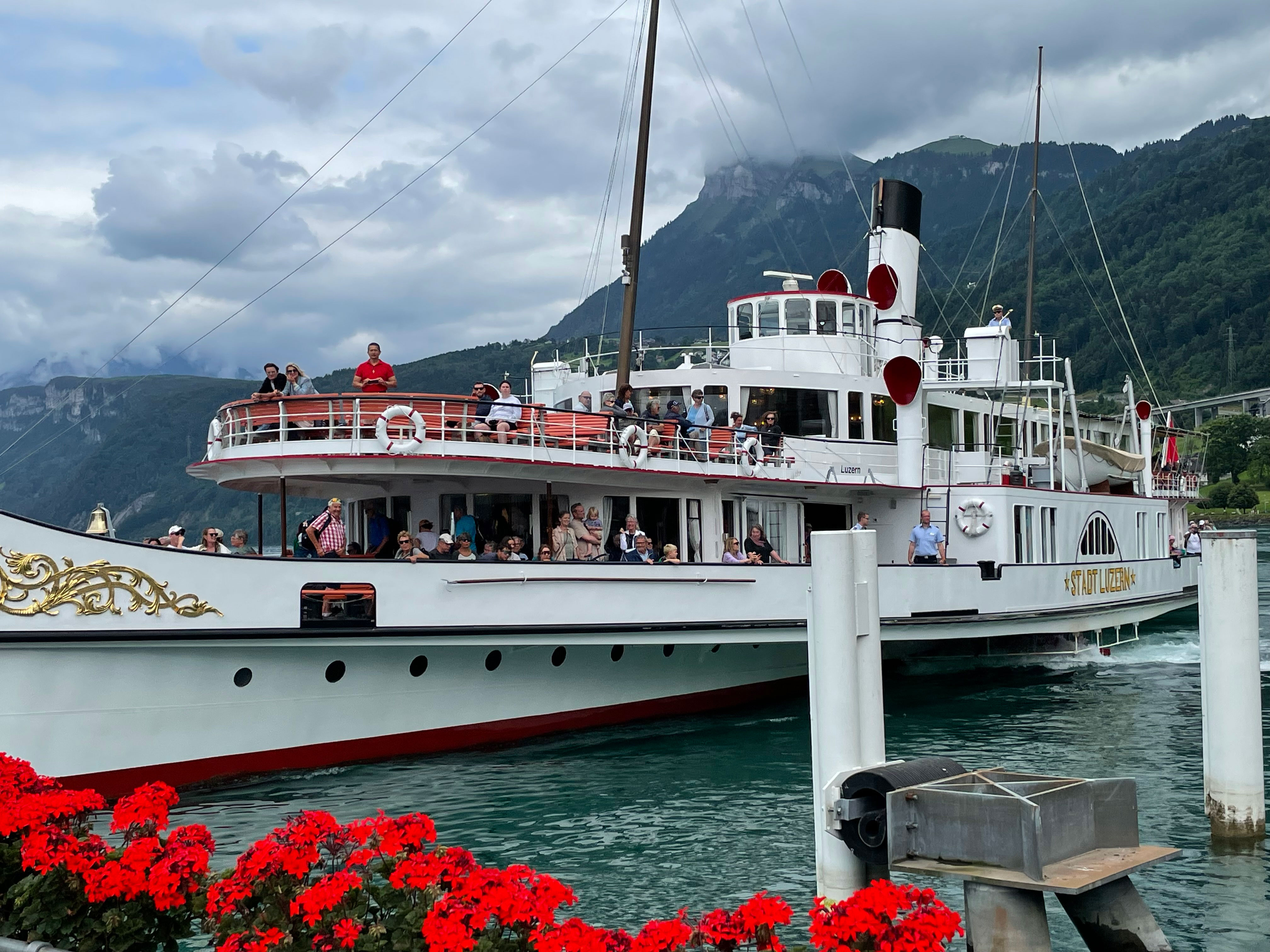 Nach dem Mittagessen gings mit der Luftseilbahn wieder zurück nach Beckenried und nach kurzem Warten erspähten wir Richtung Brunnen das nahende und wirklich imposante Seitenrad-Dampfschiff „Stadt Luzern“, welches als Flaggschiff der fünf auf dem Vierwaldstättersee noch verkehrenden Raddampfer gilt.