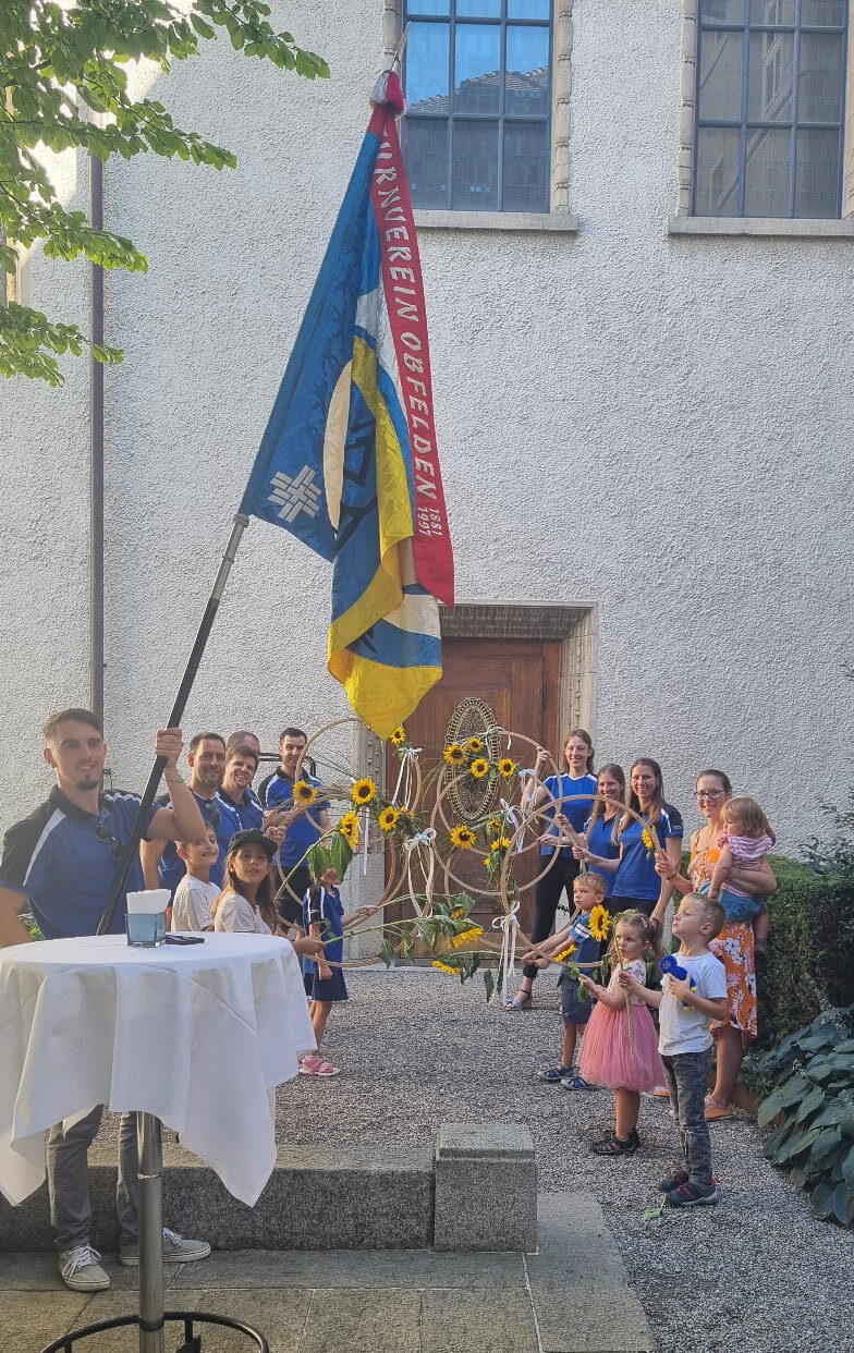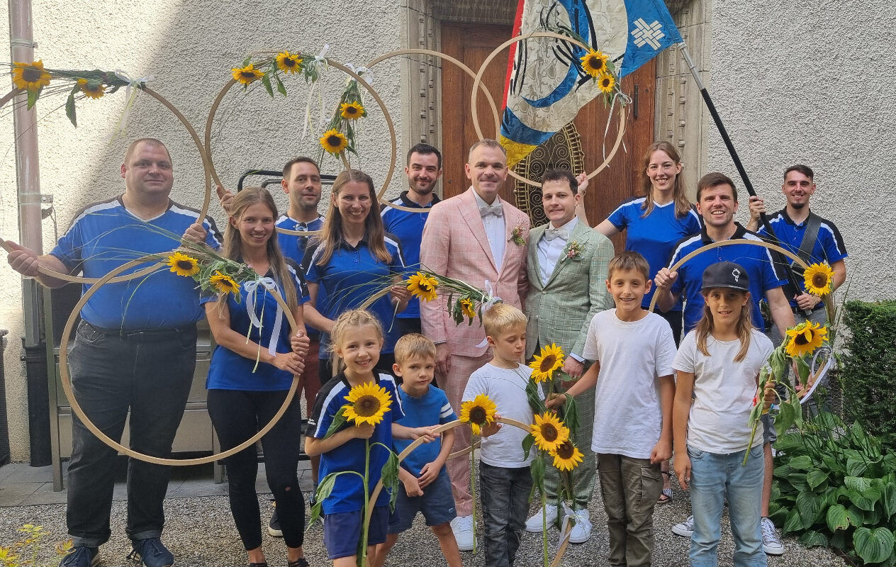 Bei schönstem Wetter ging es am Samstag, 7. September nach Zürich. Mitten in der Stadt gaben sich Mirco und Philipp das Ja-Wort. Neben vielen geladenen Gästen aus Turnvereinkreisen liessen wir es uns natürlich nicht nehmen, für unser Ehrenmitglied Mirco Spalier zu stehen. Mit einer kleinen Verspätung durch Stadtverkehr und Parkplatzsuche waren wir dann bereit und warteten auf das Ende der Hochzeitszeremonie. Der Apero wurde aufgetischt und sah verlockend aus… doch wir blieben standhaft und warteten auf das Hochzeitspaar. Um kurz nach halb zwei war es dann so weit, und wir durften nicht nur für die zwei frisch Vermählten, sondern auch für ihre gesamten Gäste Spalier stehen. Schon sehr bald kamen einige Reifen etwas tiefer – doch gewisse hielten es tatsächlich aus, den Reifen 30 Minuten lang nicht nur auf der Schulter, sondern tatsächlich hoch zu halten. Das Gym gleich neben der Kapelle lud ja auch geradezu zu einem zusätzlichen Training ein!