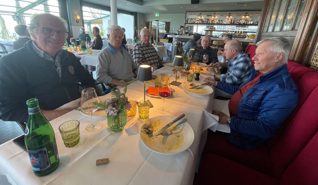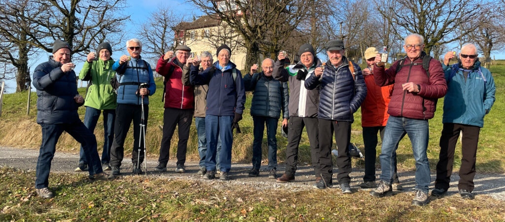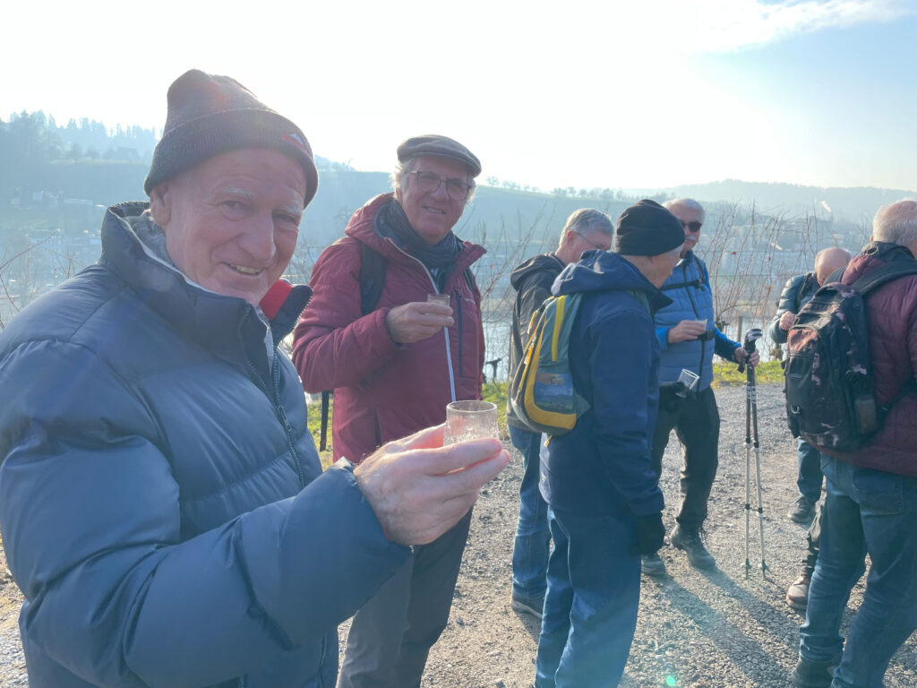 Nach einem feinen Mittagessen ging es zu Fuss weiter bis nach Horgen. Unterbrochen wurde der einstündige Marsch von einem Überraschungs-Schnäpsli aus Rolf Grubenmann’s Rucksack.