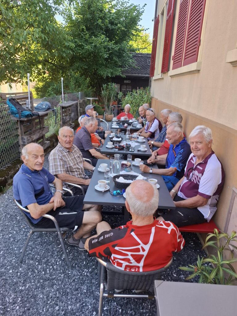 Übers Wolserholz, gings schnurstracks nach Maschwanden. Auf der hiesigen Grischheistrasse gings zuerst weitgehend eben auf geteerten,- wie auch auf Schotterwegen Richtung Islikon. Weiter gings nach Niederwil hinunter und in Mitte dieses schmucken Weilers gings leicht hoch und nach der etwas kühlenden Waldpartie in zünftigem Tempo nach Knonau hinunter. Hier im Restaurant , Depot‘ erwartete uns die freundliche Andrea, die uns rasch Kafi und Gipfeli und frisches Wasser auftischte. Grosszügigerweise hat uns Marcel Hürlimann (wegen seines kürzlichen Geburtstages) hier im Depot eingeladen – herzlichen Dank dafür. Kaum den Kaffee ausgetrunken, wurde durch Andrea überaus spontan 2 Flaschen feinen Weisswein aufgetischt, mit der eher süffisanten Bemerkung, dass diese ebenso grosszügig von Werni’s Schwager Walti Kleiner, offeriert hinterlegt wurden – Danke!