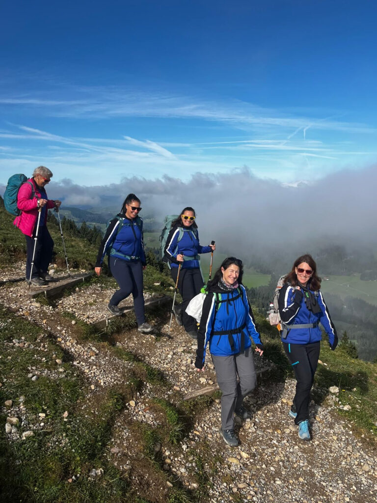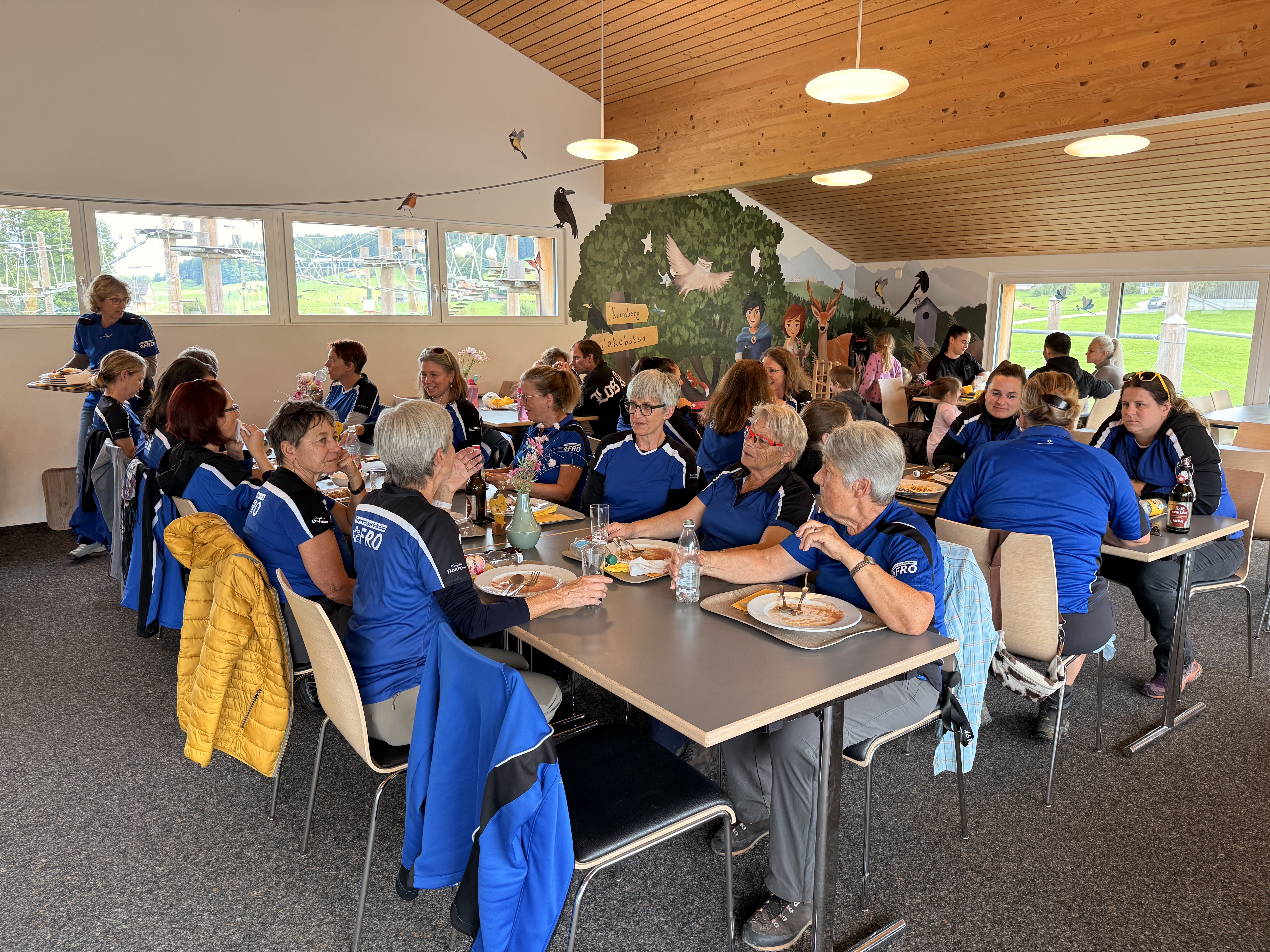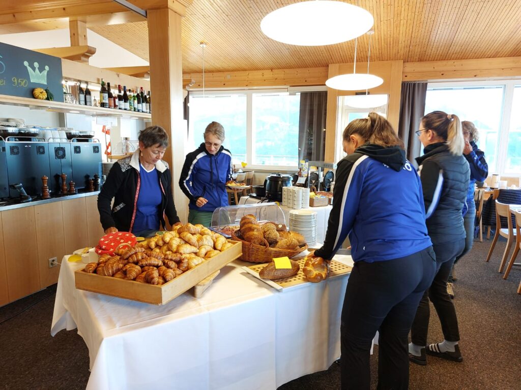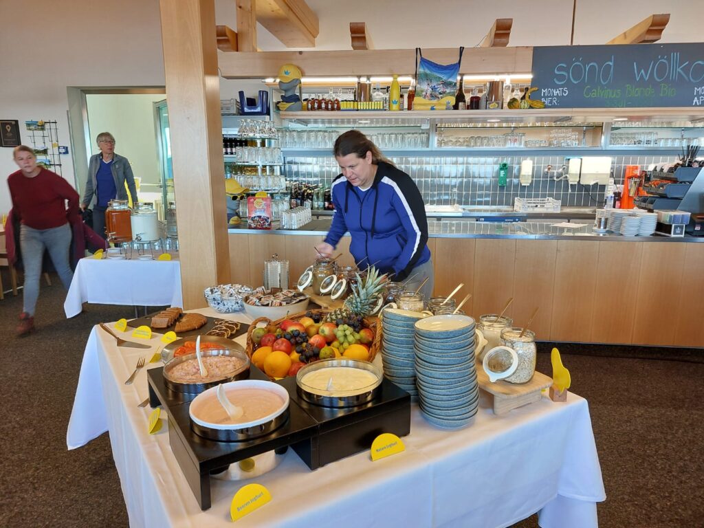 Nächster Programmpunkt war dann das Frühstück, und es war einfach grandios. Von Zopf, Gipfeli, Eierspeisen, Speck, Müsli, Früchte, Käseschnitten ja sogar ein Schoggi-Brunnen hat unsere Erwartungen völlig übertroffen, einfach sensationell. Nach dem morgentlichen Schlemmen mussten wir nun langsam wieder zusammenpacken und uns auf den Abstieg vorbereiten. Da werden noch falsche Schuhe angezogen, dass kann mal passieren, wenn mehrere die gleichen haben. Die Stimmung war super und mit vollen Bäuchen sind wir los. Ein kleines Grüppli hat sich entschieden den Rückweg mit der Seilbahn anzutretten. Und anstatt bei schönstem Wetter noch gemütlich einen Kaffee auf der Sonnenterrasse zu geniessen, nein das wäre viel zu gemütlich, haben sich die vier Frauen auf den Panoramaweg begeben. Dieser war schön, bis zum Aufstieg über eine lange Treppe durch den Wald, wieder hoch zur Bergstation. Ja der Kaffee wäre wesentlichen bequemer gewesen, aber es war trotzdem schön. Und dann gerade noch zur Talfahrt geschafft, schnell die Tickets lösen und rein in die Bahn. Merkte doch die Präsidentin, dass sie die Tickets gar nicht entgegengenommen hat, aber kein Problem, der nette, hübsche Mann von der Bahn entwertet sie gerne für uns.