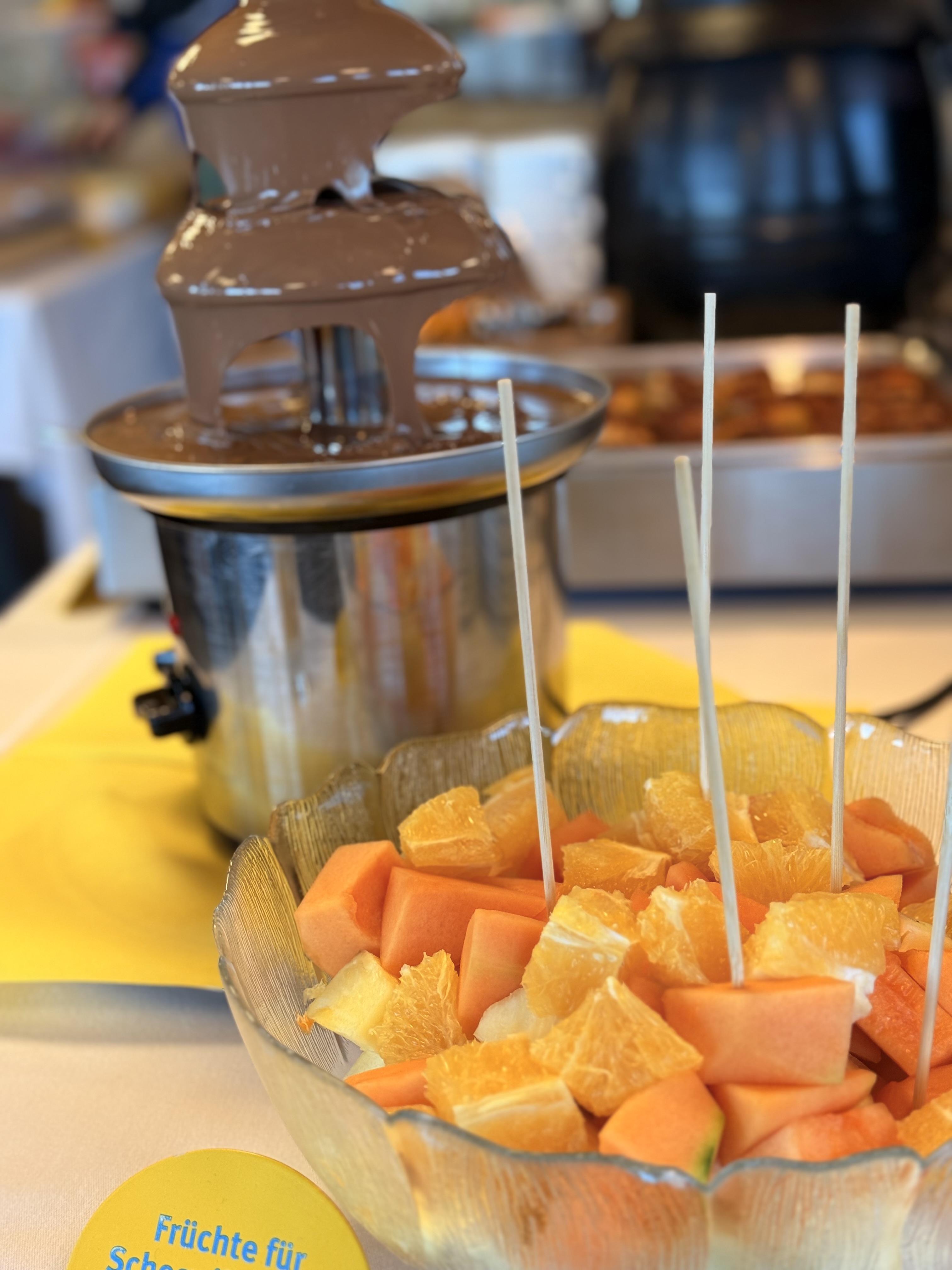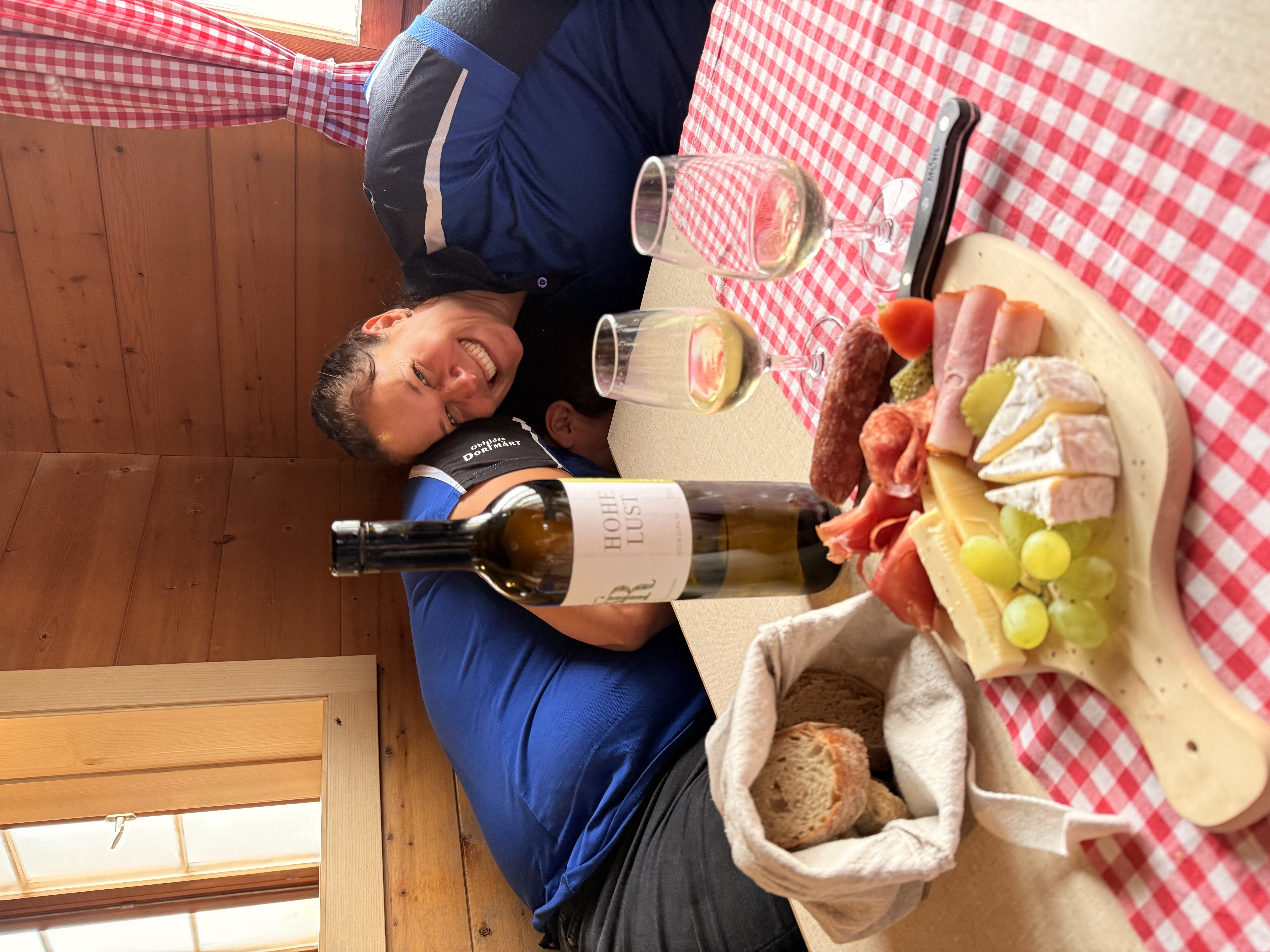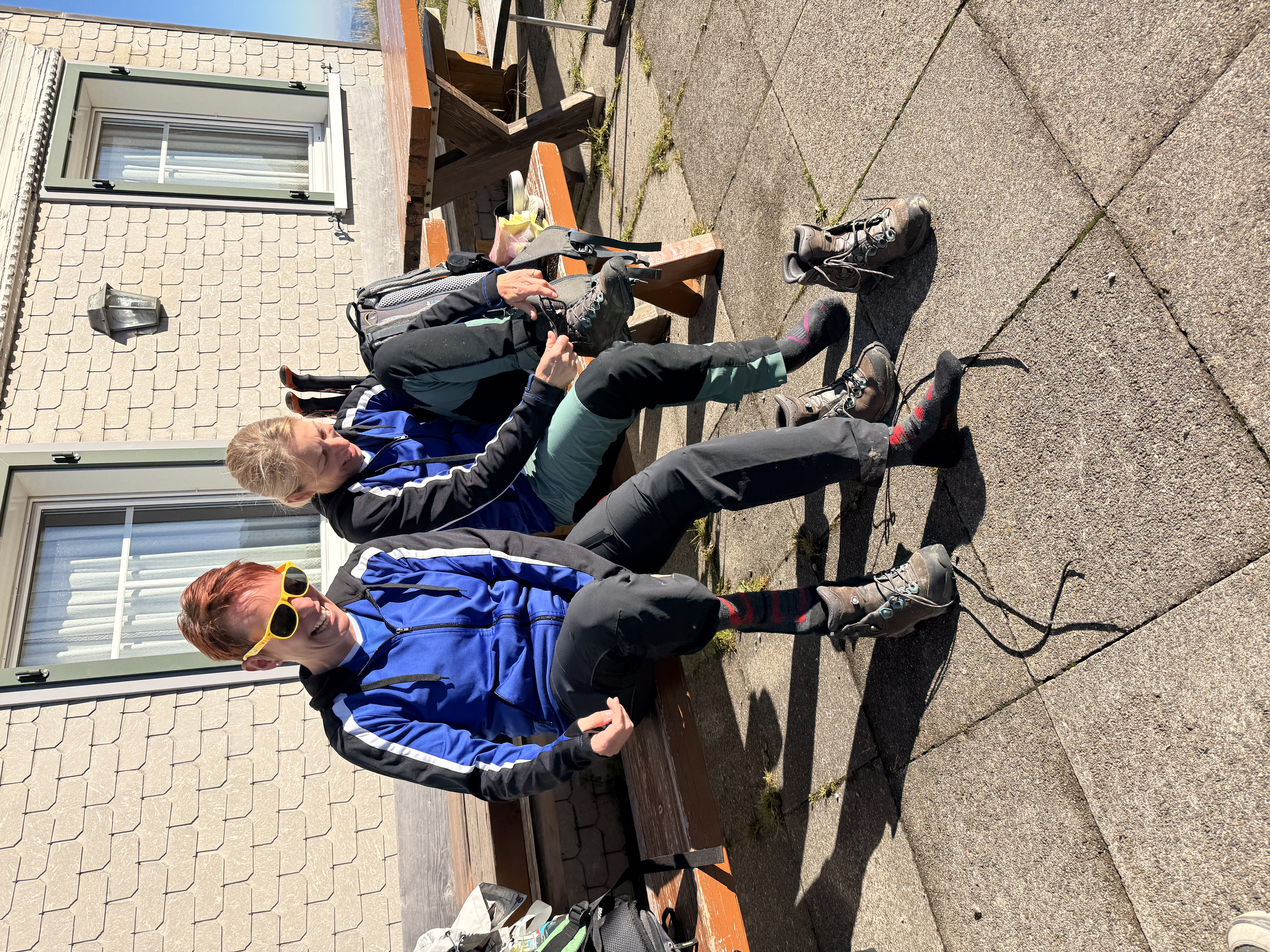 Nächster Programmpunkt war dann das Frühstück, und es war einfach grandios. Von Zopf, Gipfeli, Eierspeisen, Speck, Müsli, Früchte, Käseschnitten ja sogar ein Schoggi-Brunnen hat unsere Erwartungen völlig übertroffen, einfach sensationell. Nach dem morgentlichen Schlemmen mussten wir nun langsam wieder zusammenpacken und uns auf den Abstieg vorbereiten. Da werden noch falsche Schuhe angezogen, dass kann mal passieren, wenn mehrere die gleichen haben. Die Stimmung war super und mit vollen Bäuchen sind wir los. Ein kleines Grüppli hat sich entschieden den Rückweg mit der Seilbahn anzutretten. Und anstatt bei schönstem Wetter noch gemütlich einen Kaffee auf der Sonnenterrasse zu geniessen, nein das wäre viel zu gemütlich, haben sich die vier Frauen auf den Panoramaweg begeben. Dieser war schön, bis zum Aufstieg über eine lange Treppe durch den Wald, wieder hoch zur Bergstation. Ja der Kaffee wäre wesentlichen bequemer gewesen, aber es war trotzdem schön. Und dann gerade noch zur Talfahrt geschafft, schnell die Tickets lösen und rein in die Bahn. Merkte doch die Präsidentin, dass sie die Tickets gar nicht entgegengenommen hat, aber kein Problem, der nette, hübsche Mann von der Bahn entwertet sie gerne für uns.