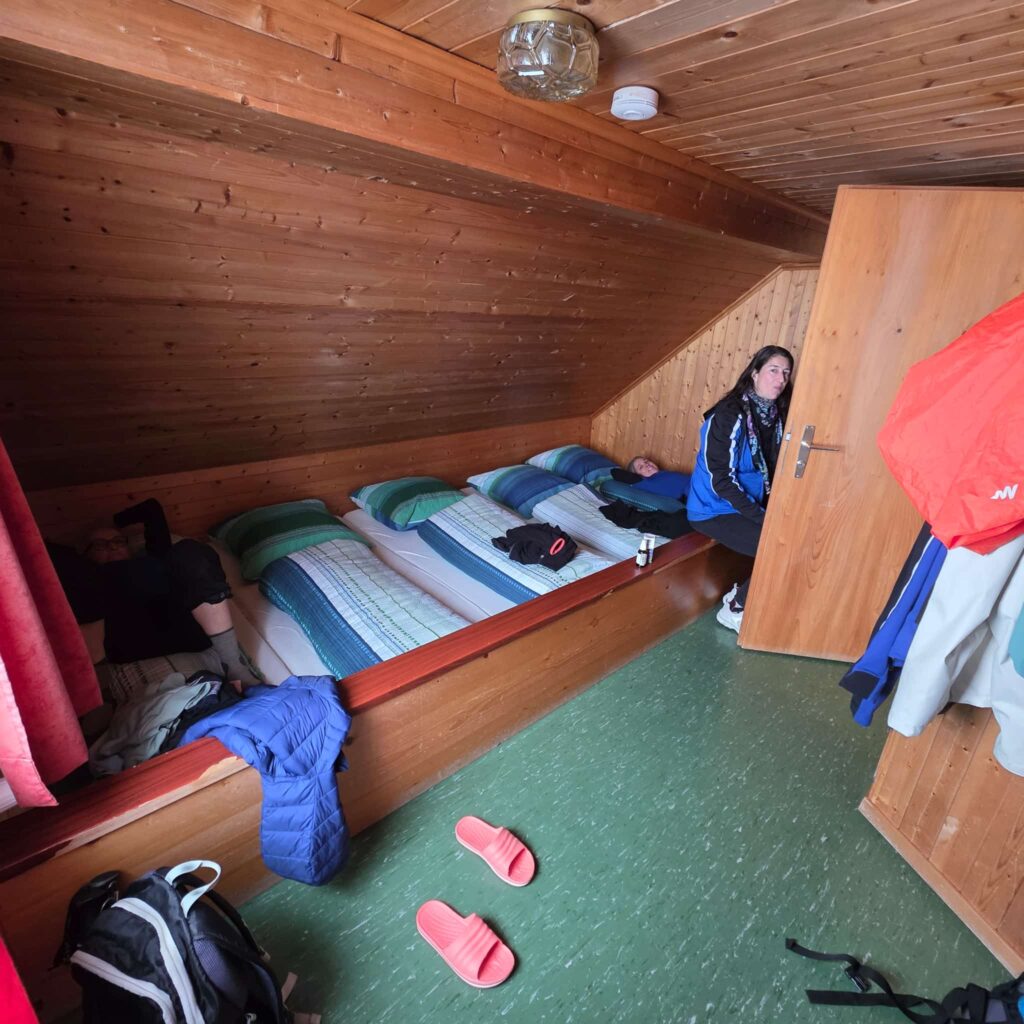 In der Grunppenunterkunft nahmen wir unsere Zimmer in Beschlag und trafen uns anschliessend im Bergrestaurant zu einem Apéro. Beim gemütlichen Zusammensitzen hat man den ersten Reisetag Revue passieren lassen. Auch Spieli wurden gemacht, Stadt-Land-Vollpfosten, ich sage nur Hanf «nähmed de Fabi das H eweg», ja es wurde viel gelacht.