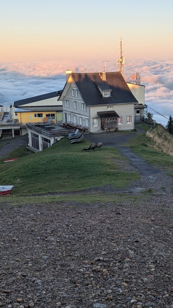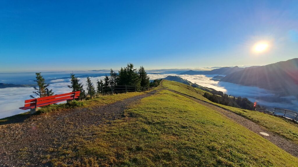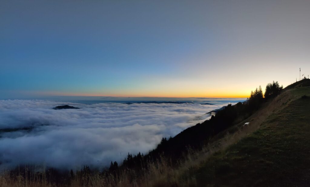 Sonntagmorgen, wow was für ein Erwachen, einfach unglaublich. Bei schönstem Wetter zeigte sich eine wahnsinns Aussicht, weit in die Berge und über das Nebelmeer. Nun war klar, es hat sich extrem gelohnt, diesen Weg auf uns zu nehmen, die Begeisterung war gross.