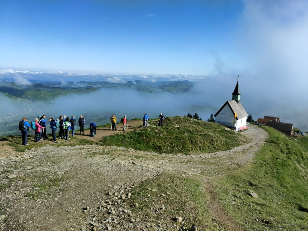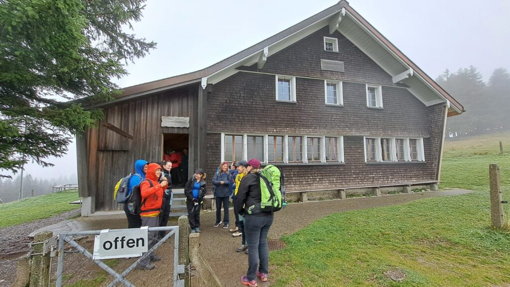 Vor dem Aufstieg kehrten wir im Restaurant Schwägalp ein für einen Kaffeehalt. Gestärkt und mit Regenausrüstung bereit, schnallten wir unsere Rucksäcke an, um uns auf den Weg Richtung Kronberg zu machen, was unser heutiges Tagesziel war. Das Wetter, naja eher neblig und kühl, aber das hat uns die Laune nicht verdorben. Nach ca. einer halben Stunde, standen wir vor der Chammhalden-Hütte, dies sei die einzige auf unserem Weg, meinte unsere Reiseleitung. So war die Frage, ob man schon wieder einkehren möchte. An einem Restaurant sollte man nie vorbeilaufen, war die Antwort eines Mitglied’s und auch die Wirtin öffnete das Fenster, winkte uns zu und lockte uns mit Kuchenwerbung hinein, also konnten wir nicht vorbei gehen. Es hat sich gelohnt, in der gemütlichen Stube wurden wir sehr herzlich empfangen und von zwei netten Frauen bedient. Mit einem Glas von hoher Lust, haben wir den Apéro eingeläutet. Die eine oder andere bestellte sich etwas zu Essen und so kam es, dass wir einmal mehr unser mitgebrachtes Essen sogar auspacken durften. Denn bei diesem Wetter wäre ein Picknick nicht so gemütlich und die Wirtin meinte, das ist doch eine Win-Win Situation für alle!