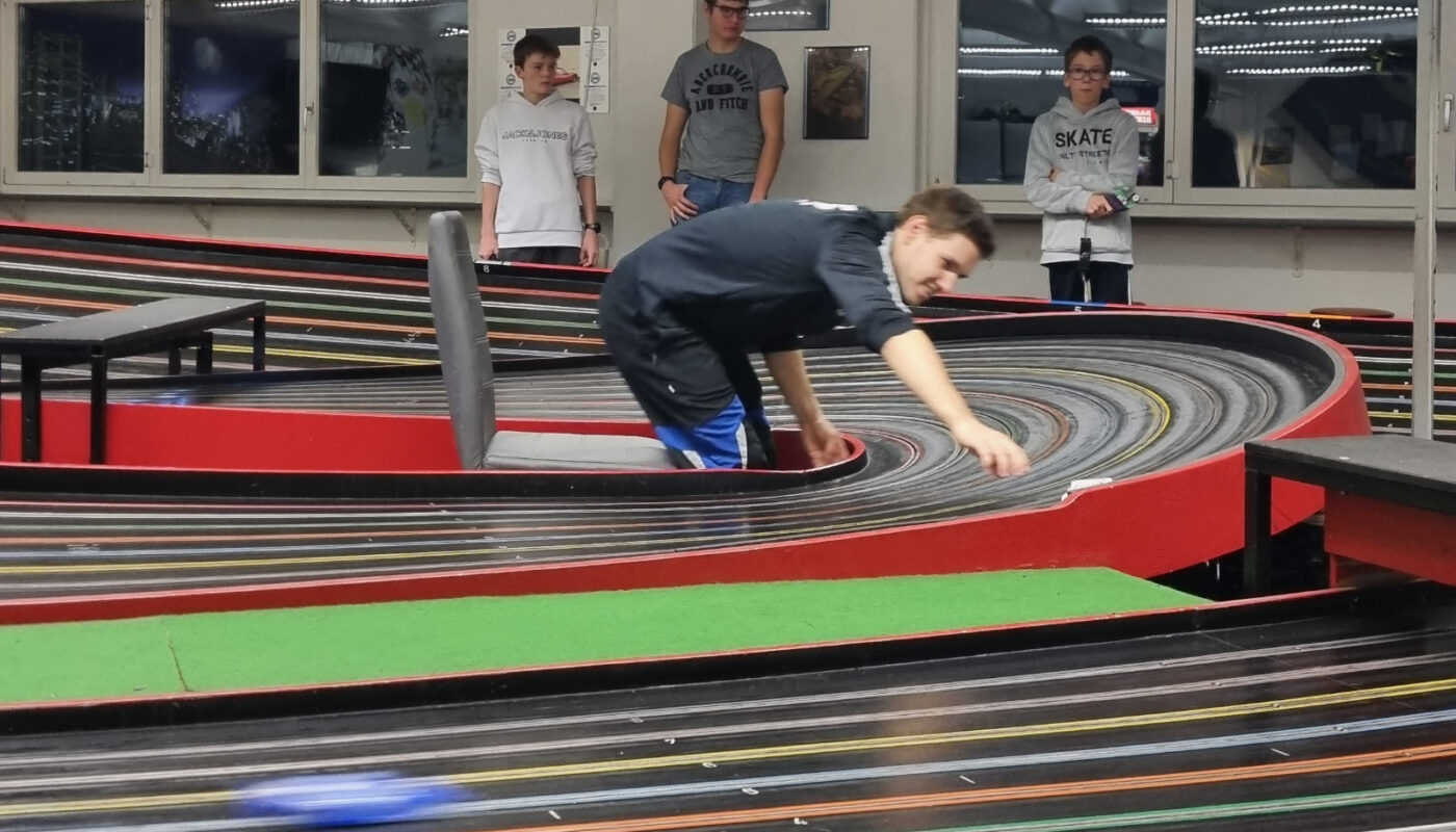 Nach einer kurzen Einführung ins Slotcar-Racing, also wie man mit den kleinen Autos nicht sofort aus der Kurve fliegt, ging es direkt los mit den Trainingsrunden. Die TV-ler wurden in zwei Gruppen aufgeteilt: Die einen durften Vollgas geben und sich an den verschiedenen Spuren versuchen, während die andere Gruppe die ehrenvolle Aufgabe der „Einsetzer“ übernahm.