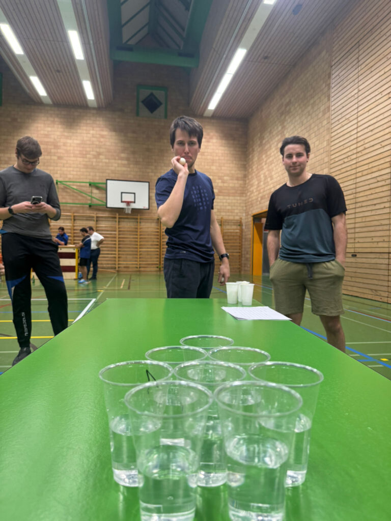 Dann ging der Spass auch schon los: Da ging es zum Beispiel darum, ein Getränk (traditionell ein Bier/Cüpli), so schnell wie möglich zu exen. Selbstverständlich gab es auch eine jugendfreundliche Alternative: Rimuss. So konnte jeder auf faire und sichere Weise antreten. Eine Person stoppte die Zeit, während die anderen tranken. Die Spannung stieg von Runde zu Runde, es gab mehrere knappe Zeitduelle, bei denen jede Millisekunde zählte. Am Ende lag der Sieger nur um Haaresbreite vorne.