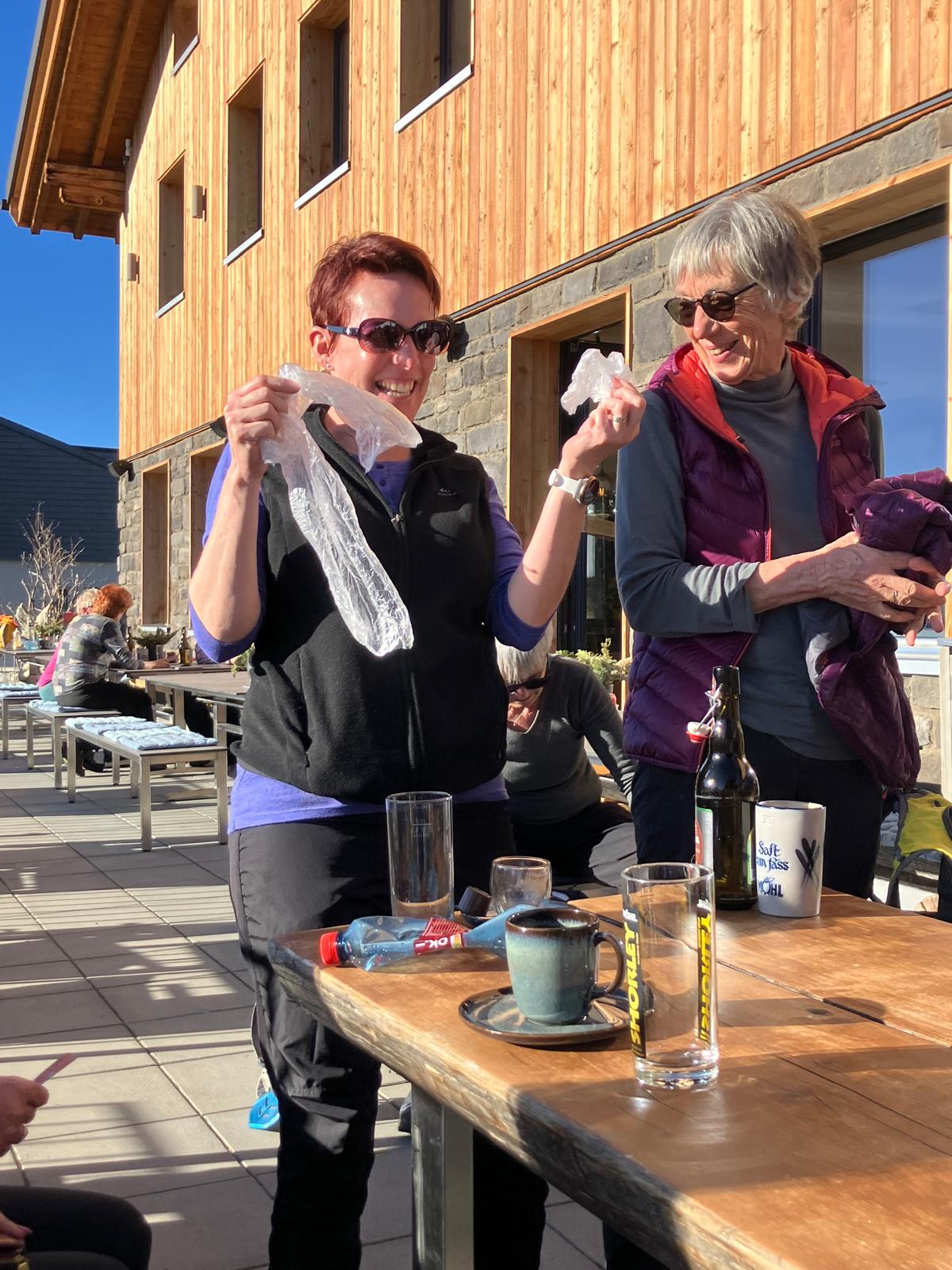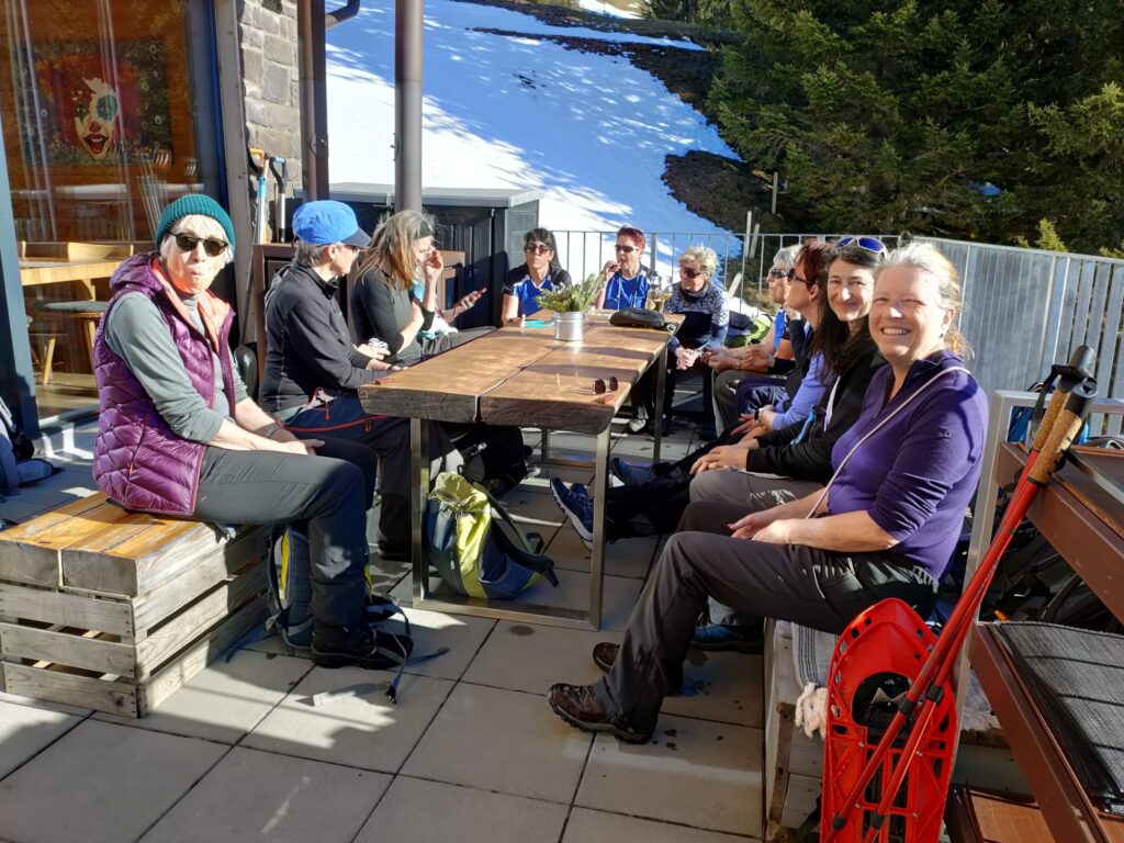 Nacheme Dessert, feine Kafi evt. mit Schuss und em WC-Gang ohni Spüelig, defür mit Wasser schöpfe – wie gnüss ich jetzt mis WC wider!!! und em obligate Gruppeföteli, mit original Fingerabdruck vom Wirt, simmer ufbroche. D Mirj staht echli schräg uf de Schue!? Ah das muess so sii…!! De höchsti Punkt 1874 m. ü. M ebä d Hüenderegg hämmer mit volle Büch erstiege. Nöd all sind mitcho, die hämmer dänn am Schluss wider troffe. Dänn isches abwärts gange, meh oder weniger gsittet, bi 15 Fraue! Bis dänn öisi Berggeisse, Mirj und Trudi, usbroche und de unberüehrti Hang durab grutscht sind. Det isches passiert, d Mirj isch umgheit und? Riemlibruch!! De underi Teil isch ganz wegbroche, so fescht, dass nüd meh gnützt hät, au keis Riemli vo de Eva!! und d Mirj de Schue hät müesse abzieh und i dem immer weichere Schnee ohni die breiti Flächi, müehsam witerlaufe.. Lustigi Bilder häts gä, immer wieder isch sie plötzli en halbe Meter witer unne gsi… Puhh, guet isch sie na jünger, ich hetti das nöd möge, immer wieder mich usem Schnee use z’stämme, mir häts glanged nachemene sanfte Sturz, won i wie en Chäfer uf em Rugge glandet bin und nur mit Hilf wider ufstande bin… Immer wärmer isches worde, de Schnee immer weicher und weniger und immer meh bruni Fläcke häts gä, mängsmal so vill brun, dass es paar Fraue beschlosse händ d’Schneeschue abzieh, nöd die bescht Idee.. Juhuii d Bergstation Eggberge isch vor öisere Nase gsi und d’Usrisser händ öis en gmüetliche Platz reserviert, Dankä. Öise Ängel s’Trudi, hät öis mit de nötige Vitamine versorget, e roti Wälle, wer meh wott wüsse, muess nöchst mal mitcho. Toffifee sind plötzlich au na uf em Tisch gläge, na meh Vitamine!! Dankä Yolanda. So jetzt nachli Bei streckä und plötzli chunt d Mirj barfuess z’laufe, was isch dänn jetzt scho wider?? Dur de vill Schnee händ d Schue durela und mer hät chönne d Sohle richtig usdrucke so vill Wasser häts im Schue gha. Aber au da weiss »Frau» Bscheid, Original Mirj:
