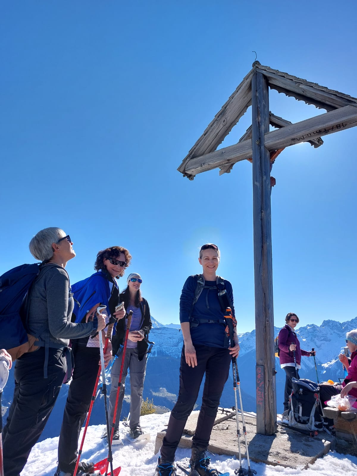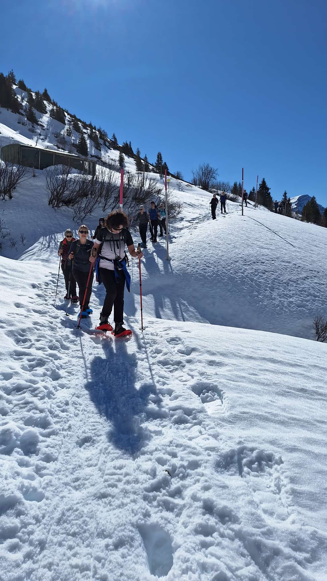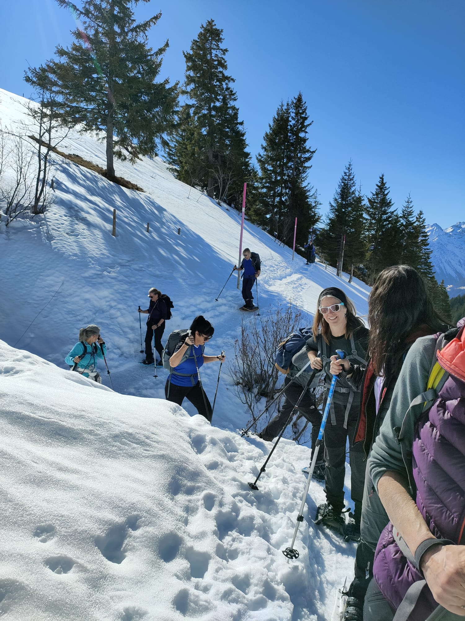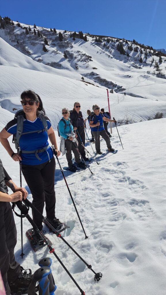 Und jetzt s montiere vo de Schneeschue, all Jahr s gliche Drama!! Wie legg ichs a, wo müend jetzt d Riemli ane, inne oder usse? und hebets??? Mir sind ja immer nachli gschädiget vo de letschtjährige Schneeschuetour…D Maja hät scho vorgsorget, ihri Schue händ das Jahr nume en Chnopf zum drehe. D’Eva hät 2m Riemli mitgnah, mir sind versorged, sött mer meine!! Plötzli en Schrei und Bluet im Schnee, was isch passiert? En Unfall? Riemli explodiert? Nei, en Teleskopstock hät de Klara d Huut iklämmt und ufgrisse. Dank sofortiger Reanimation und Verarztig vor Ort, isch d Patientin wider marschbereit gsi…Es isch im Fall erst 10i und scho so vill Ufregig!