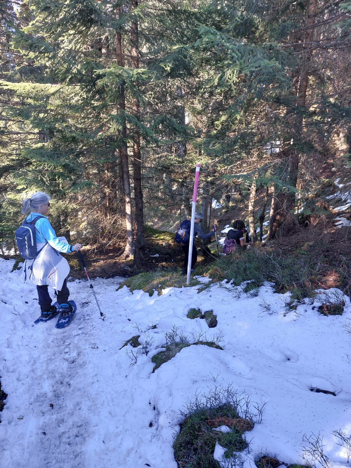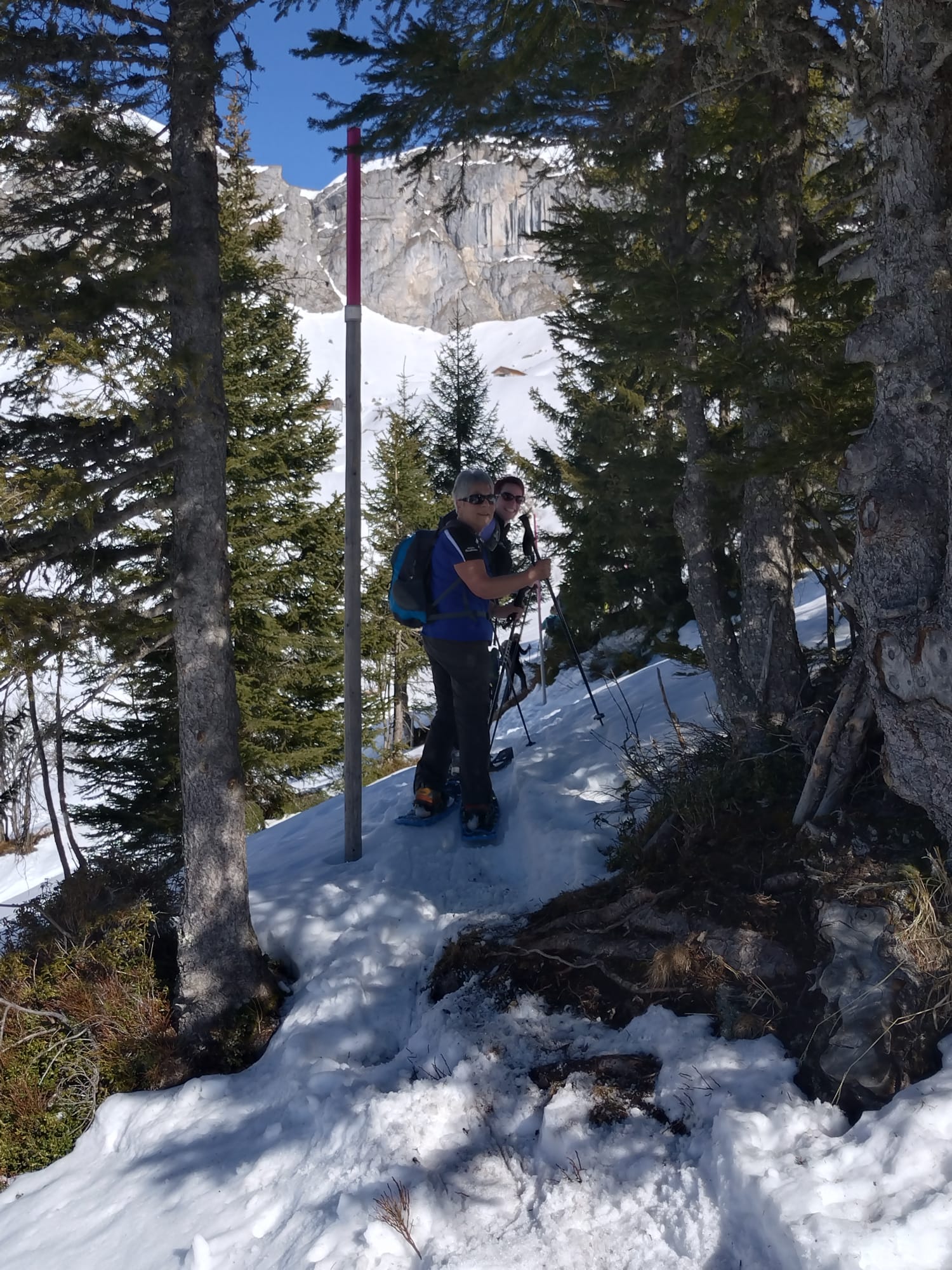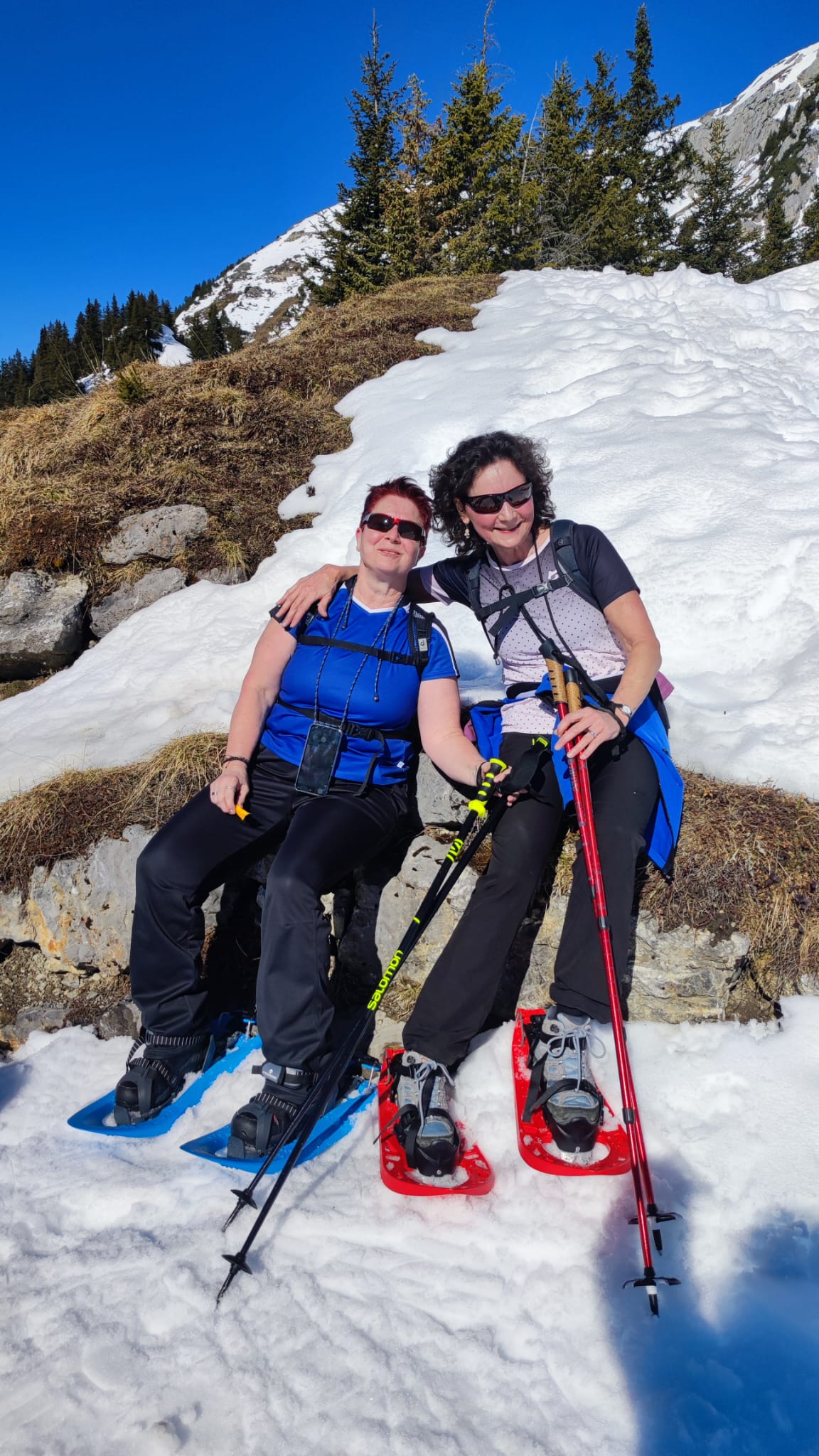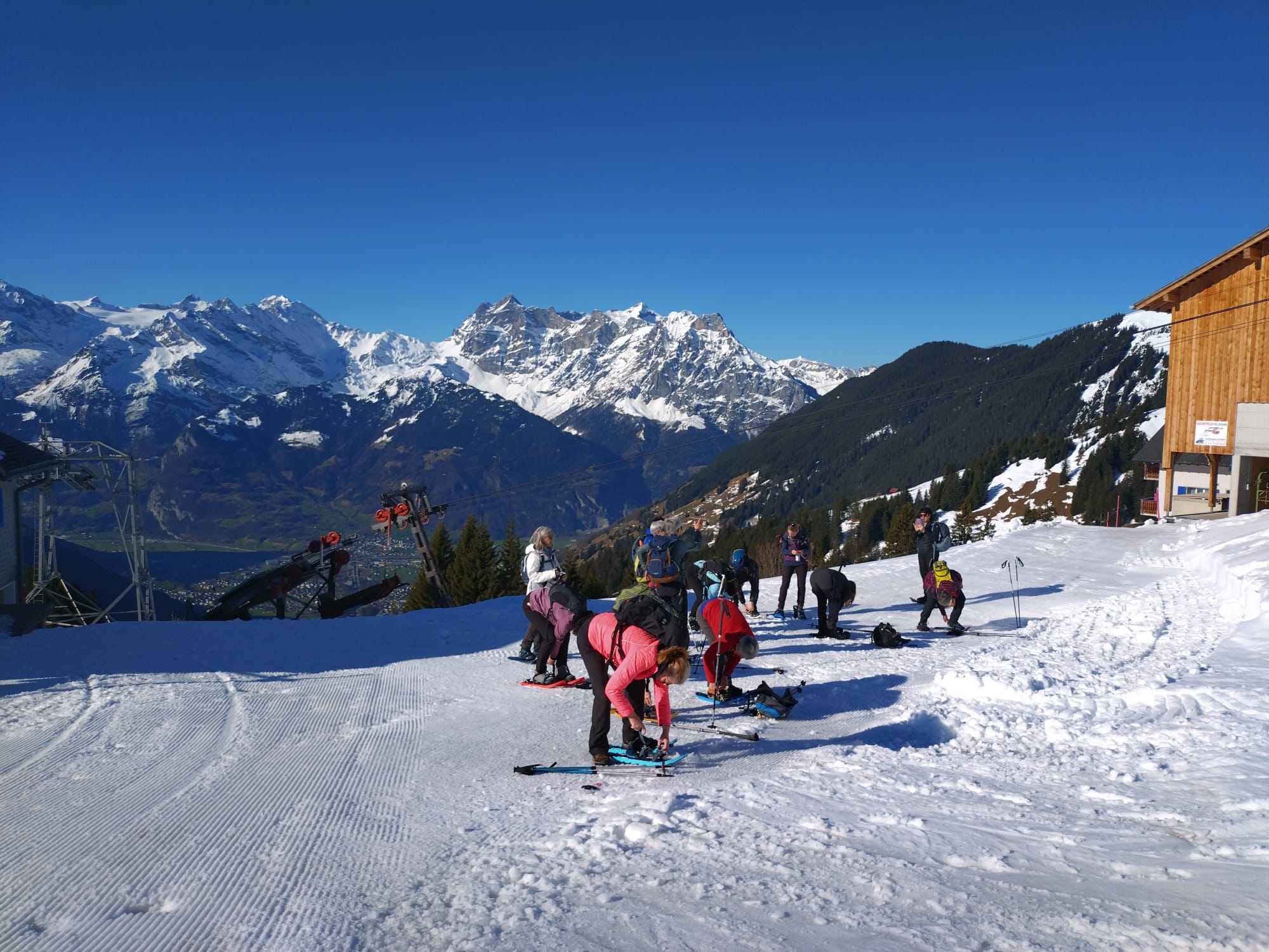Und jetzt s montiere vo de Schneeschue, all Jahr s gliche Drama!! Wie legg ichs a, wo müend jetzt d Riemli ane, inne oder usse? und hebets??? Mir sind ja immer nachli gschädiget vo de letschtjährige Schneeschuetour…D Maja hät scho vorgsorget, ihri Schue händ das Jahr nume en Chnopf zum drehe. D’Eva hät 2m Riemli mitgnah, mir sind versorged, sött mer meine!! Plötzli en Schrei und Bluet im Schnee, was isch passiert? En Unfall? Riemli explodiert? Nei, en Teleskopstock hät de Klara d Huut iklämmt und ufgrisse. Dank sofortiger Reanimation und Verarztig vor Ort, isch d Patientin wider marschbereit gsi…Es isch im Fall erst 10i und scho so vill Ufregig!
