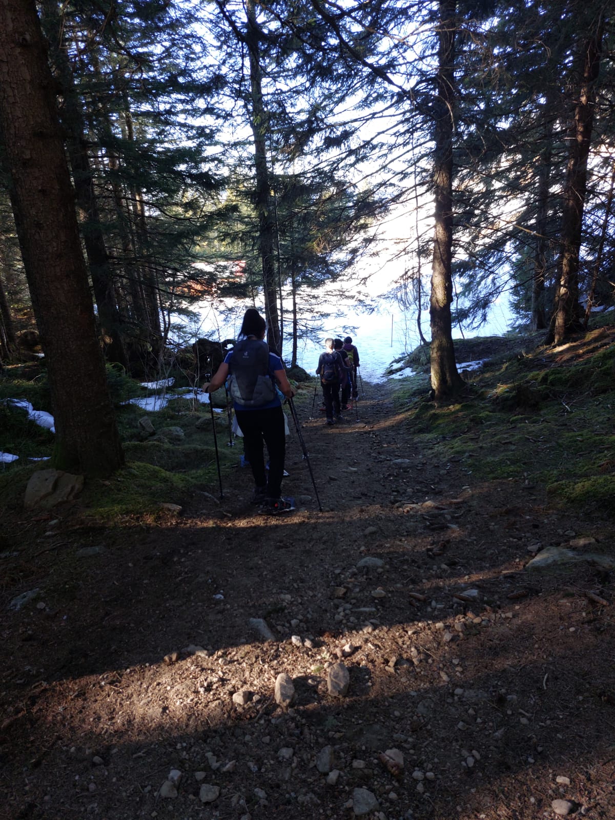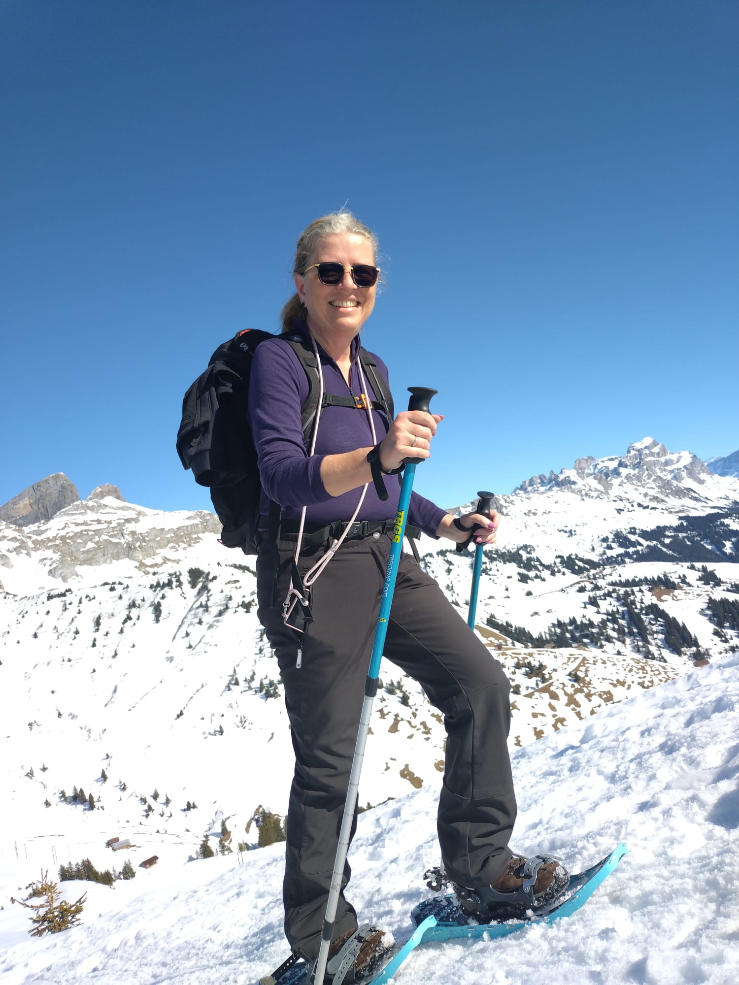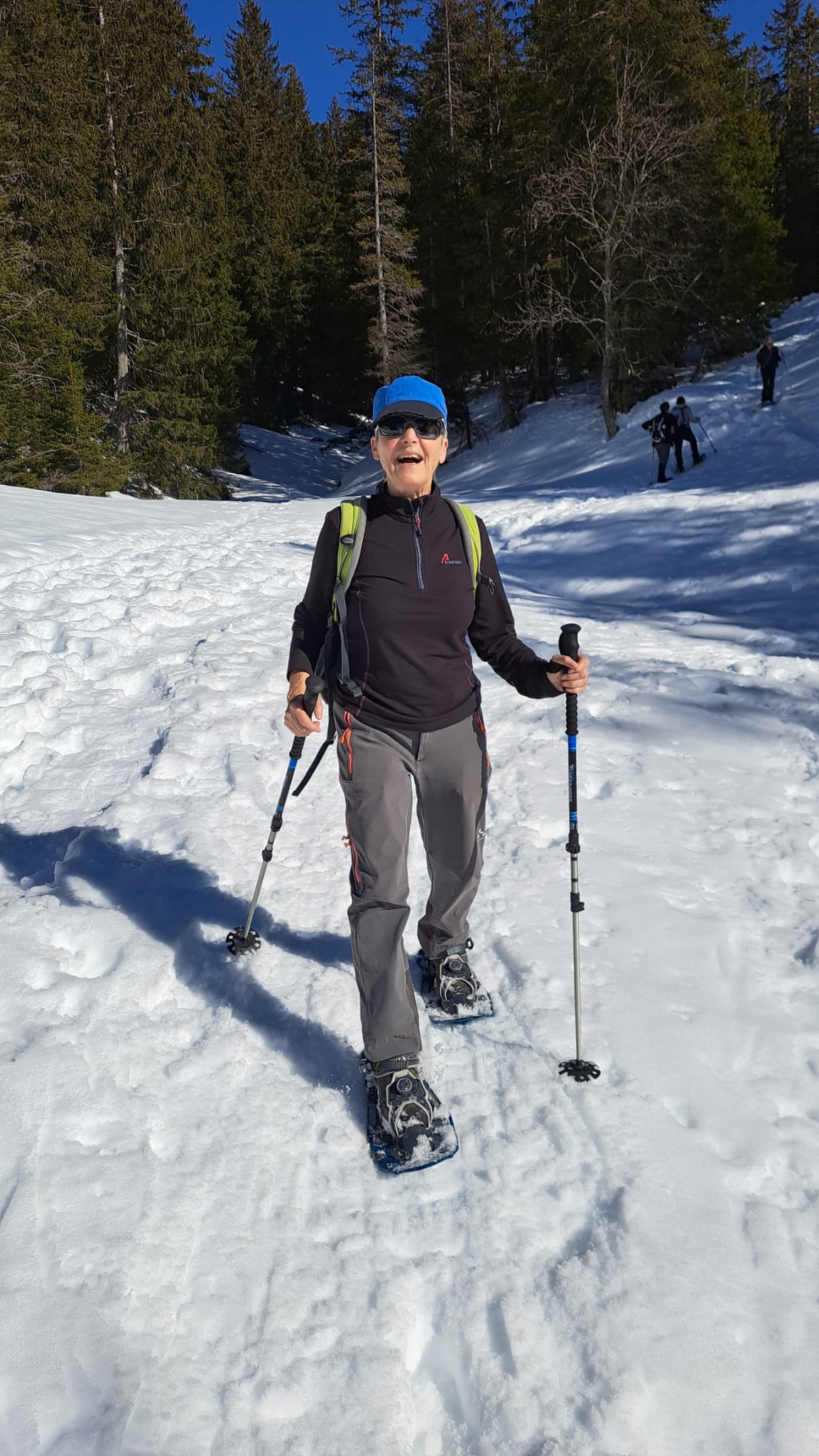 Und jetzt s montiere vo de Schneeschue, all Jahr s gliche Drama!! Wie legg ichs a, wo müend jetzt d Riemli ane, inne oder usse? und hebets??? Mir sind ja immer nachli gschädiget vo de letschtjährige Schneeschuetour…D Maja hät scho vorgsorget, ihri Schue händ das Jahr nume en Chnopf zum drehe. D’Eva hät 2m Riemli mitgnah, mir sind versorged, sött mer meine!! Plötzli en Schrei und Bluet im Schnee, was isch passiert? En Unfall? Riemli explodiert? Nei, en Teleskopstock hät de Klara d Huut iklämmt und ufgrisse. Dank sofortiger Reanimation und Verarztig vor Ort, isch d Patientin wider marschbereit gsi…Es isch im Fall erst 10i und scho so vill Ufregig!