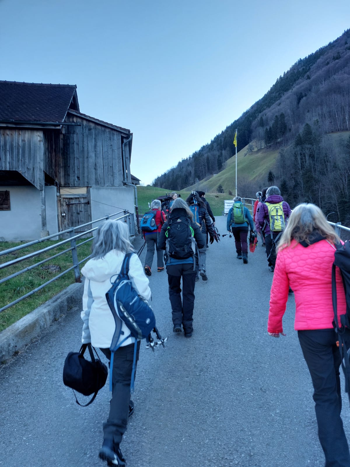 15 Fraue händ sich am 7.15 Uhr uf em Zendi PP i 3 Autos verteilt. Mit em flüssige Verkehr, simmer gli in Flüele uf em PP vo de Eggberge Luftseilbahn acho. D Bushaltestell isch grad gägenüber gsi. De Bus isch cho und d’Rue verbi… bis ad Talstation Kinzig hät er öis chauffiert.