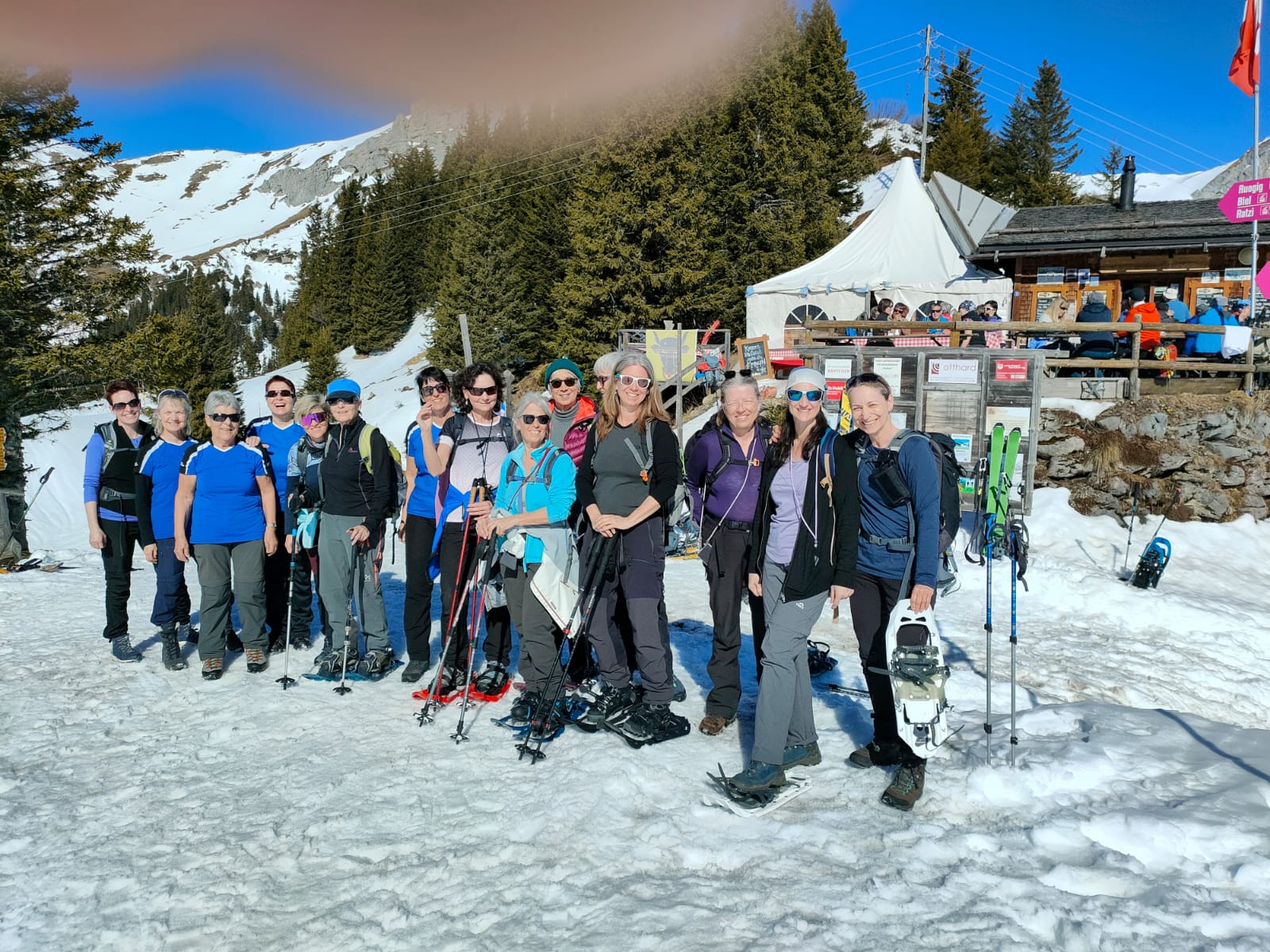 Abmarsch i die wunderschöni wissi Bergwält mit Panoramablick, Sunne und blauem Himmel uf em Winterwanderweg. Sanft und gmüetlich isches berguf und gradus gange. Gli händ die erste Fraue scho mind. 1 Schicht Chleidig müesse abzie, so warm isches gsi. En Hund hämmer zwüschedure bespassd, händ em Schneeballe zuegrüehrt und er hät sie mit elegante Sprüng gfange, bi mir hettis echli anders usgseh… E gueti Stund simmer gwanderet, plötzli heissts « Stopp, Riemlibruch!» de Mirj ihre Schue, usgleiht vo de Nachbarin, isch unde a de Sohle broche… de Eva ihre erst Meter muess herä. De Rega, wo grad heregfloge isch, hämmer chönne abbrichte, flotte Service. Nach em Ruogig, en Wiler bim andere Seilbähnli, hät dänn de Schneeschuewäg agfange und erst jetzt eigentli sind die Schneeschue brucht worde! Amene herzige Bäsebeizli grad am Wäg hämmer mit brüelende Auge müesse verbilaufe, nüt häts gheisse. Die nöchste Beizlis sind zue gsi… e schlächts Omen? De höchsti Punkt, d Hüenderegg isch in Sichtwiti und de Fleschkiosk, öisi Mittagspause grad hine une. Na es paarmal ufe und abe und mir sind fründlich empfange worde, e wahnsinns Ussicht zum Vierwaldstättersee bis hindere zum Sempachersee, lut em Beizer. Chässchnitte, Suppe, Würstli, mmhh fein ischs gsi…Und s Motto «Komme als Gast, gehe als Freund» hät genau passt.
